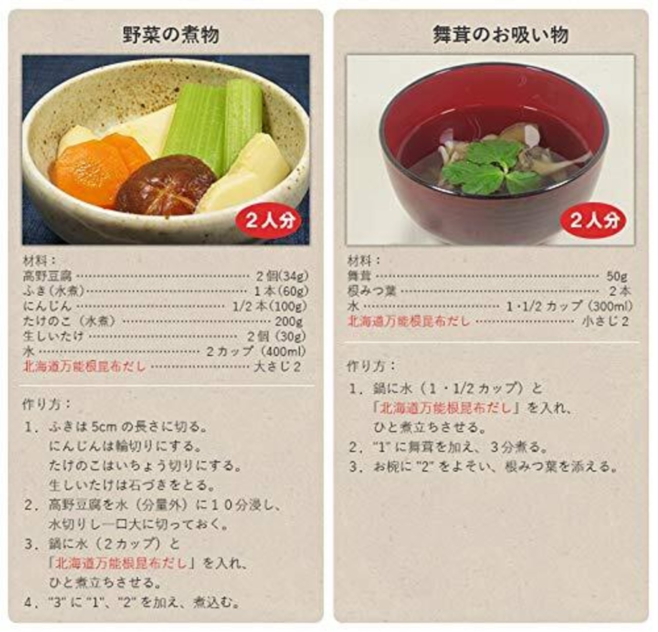 昆布エキス(昆布(北海道日高))、昆布だし(昆布(北海道日高))、食塩、かつお節エキス、かつおだし/調味料(アミノ酸等)、増粘多糖類、(一部に大豆を含む)
