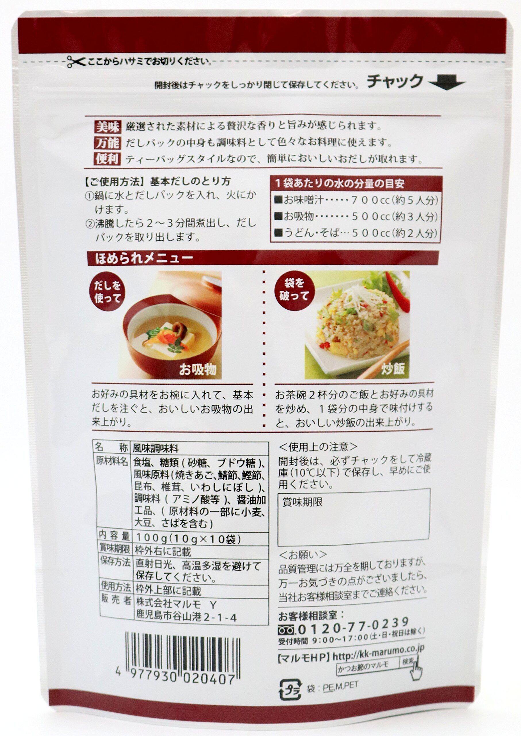 【原材料名】食塩(国内製造)、糖類(砂糖、ブドウ糖)、風味原料(焼きあご、さば節、かつお節、昆布、しいたけ、いわし節)、しょう油加工品(小麦、大豆を含む)/調味料(アミノ酸等) 【栄養成分表示 1袋(10g)当たり】エネルギー27kcal たんぱく質2.7g 脂質0.7g 炭水化物2.4g 食塩相当量3.8g ※この表示値は、目安です。