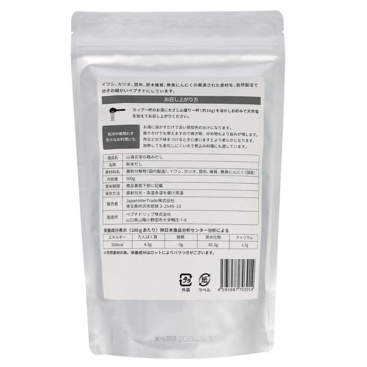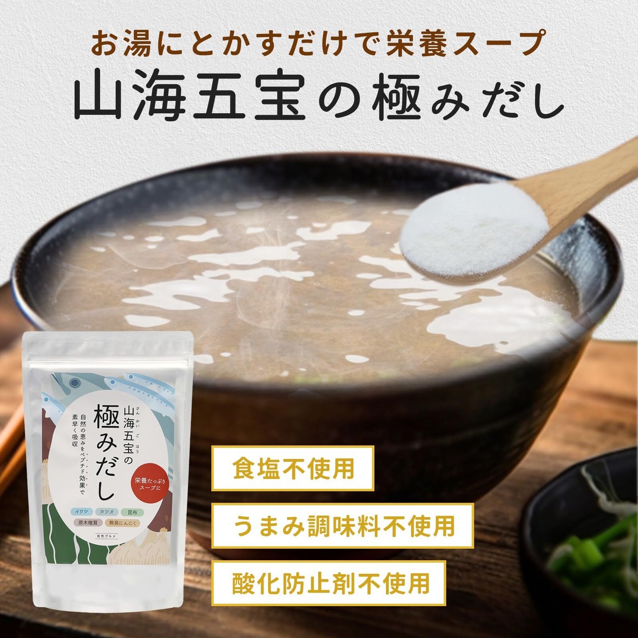 だし 無添加 山海五宝の極みだし 出汁 和風だし 国産 食塩不使用 500g ペプチド 栄養スープ 天然成分100% 料亭の味 虹色グルメ