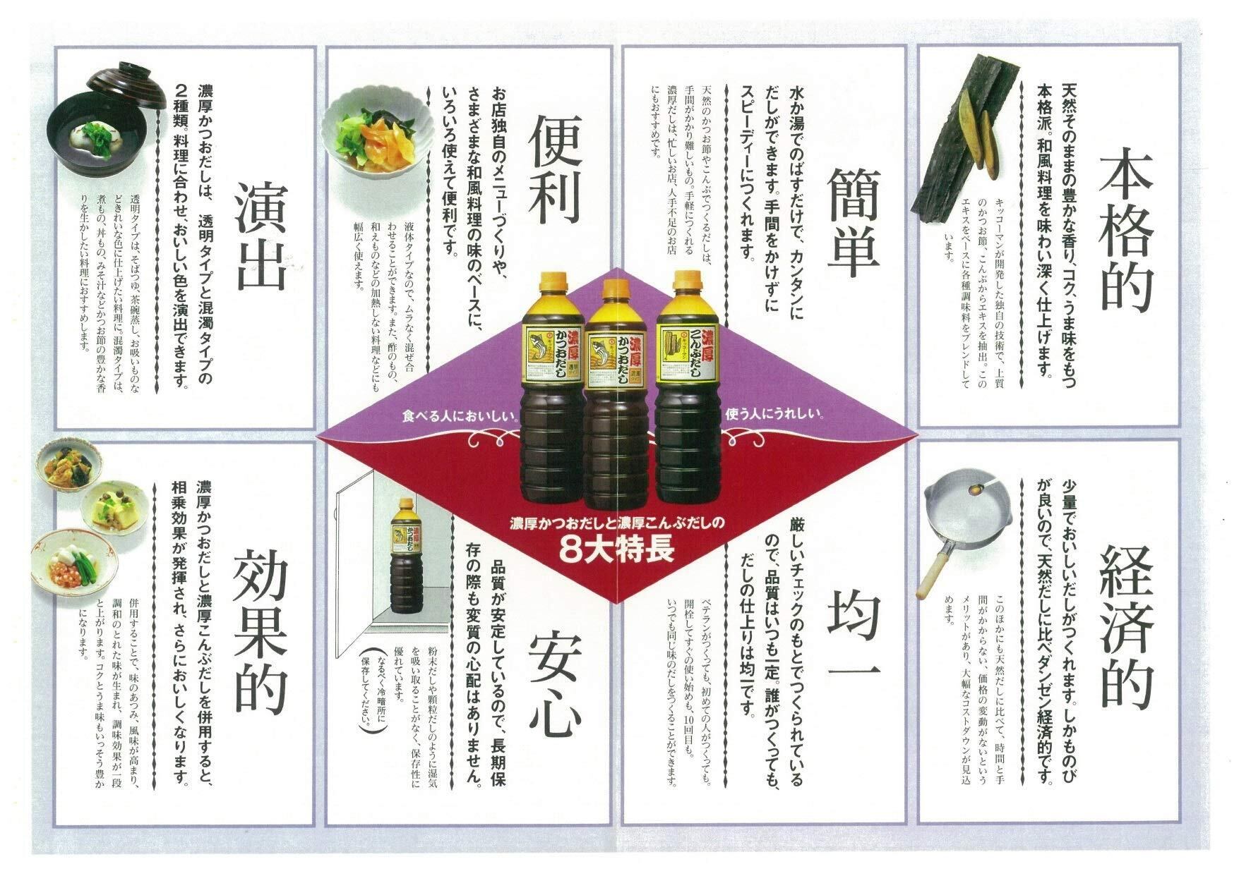 濃厚かつおだしの姉妹品です。香りもコクもうまみも、こんぶだしならではのおいしい味が即座に引き出せ、だしをとる手間が省けます。品質も一定しており取扱いや保存も簡単です。みそ汁、お吸い物、茶わんむし、煮物、丼物、炊き込みご飯の他、酢の物や和え物などさまざまな和風料理にお使いいただけます。透明タイプなので、つゆやお吸い物、和え物などにぴったりです。