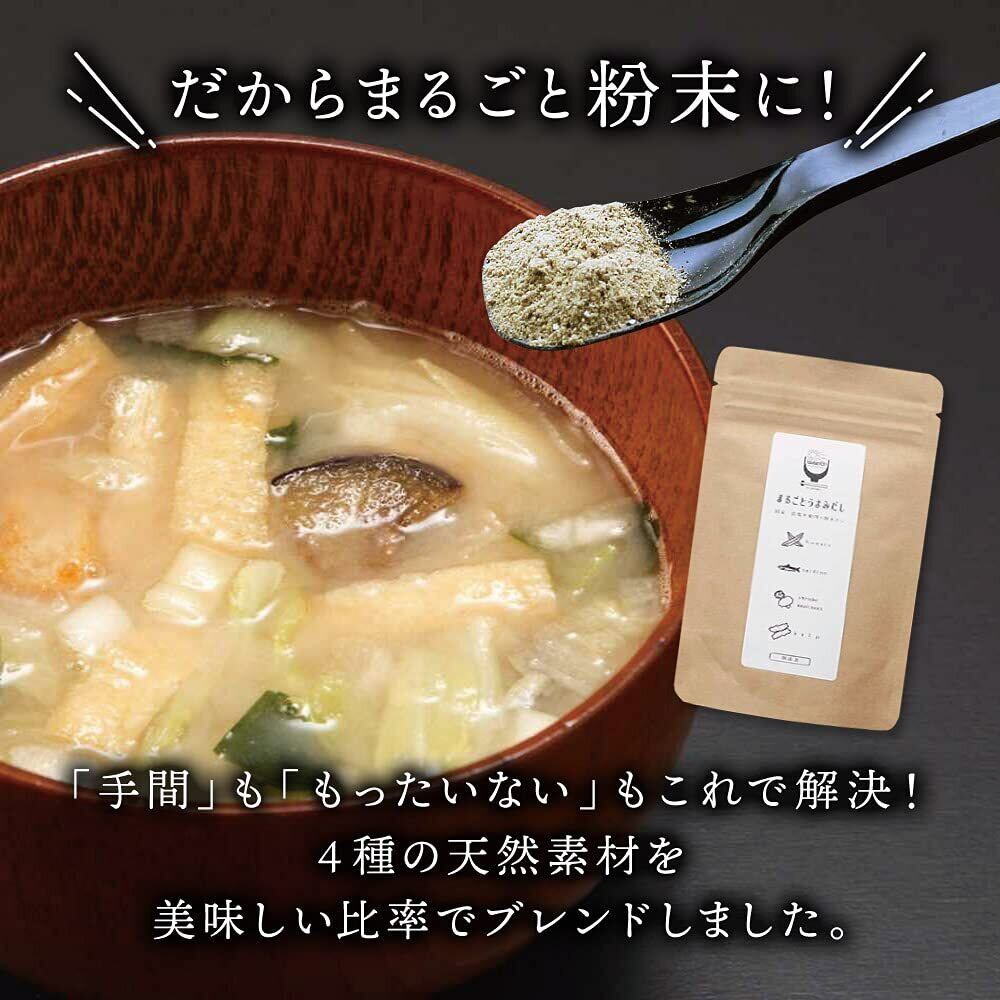 【まるごと粉末に】 だしを一からとるのは結構難しい…。かといって、だしパックは量の調整が難しいし、コスパが良くない…。だから、まるごと粉末にしちゃいました!「手間」も「もったいない」もこれで解決!