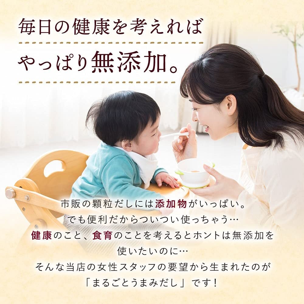 【安心の無添加】 毎日の健康を考えれば、やっぱり無添加。市販の顆粒だしには、添加物がいっぱい。でも便利だからついつい使っちゃう…。健康のこと、食育のことを考えると本当は無添加を使いたいのに…。そんな当店の女性スタッフの要望から生まれたのが、「まるごとうまみだし」なんです。だしを変えて、やさしいお味噌汁をはじめてみませんか?