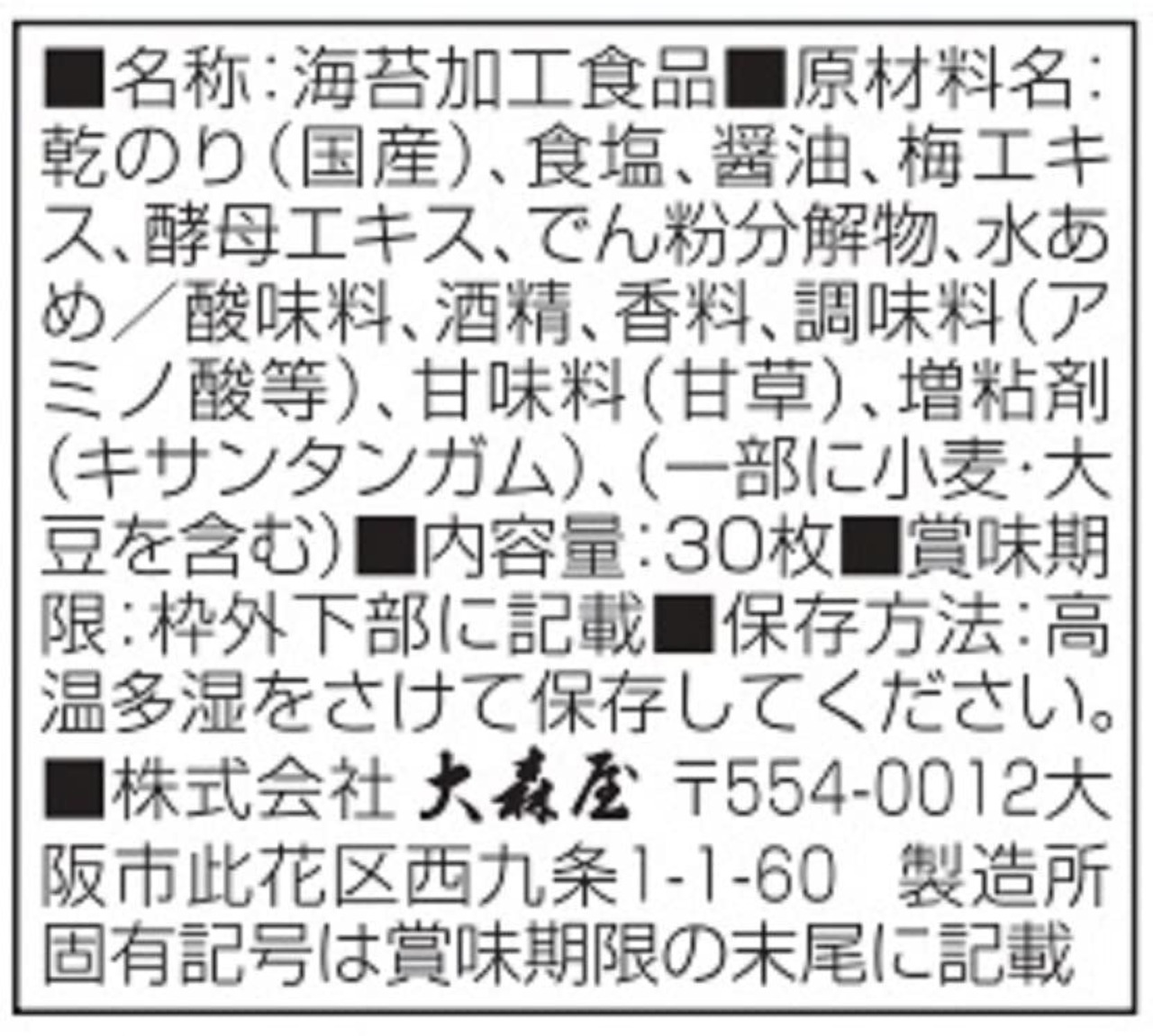 原材料:乾のり(国産)、食塩、醤油、梅エキス、酵母エキス、でん粉分解物、水あめ/酸味料、酒精、香料、調味料(アミノ酸等)、甘味料(甘草)、増粘剤(キサンタンガム)、(一部に小麦・大豆を含む)