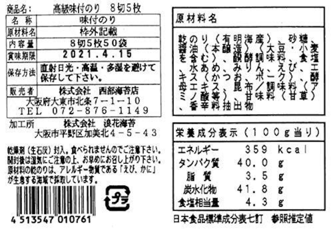乾のり(有明海産)、砂糖、醤油(本醸造)、発酵調味料、食塩、水あめ、味醂、えび、エキス(かつお、ポーク)、酵母エキス、昆布/調味料(アミノ酸等)、甘味料(甘草)、香辛料抽出物(※原材料の一部に小麦、えび、大豆、豚肉を含む)