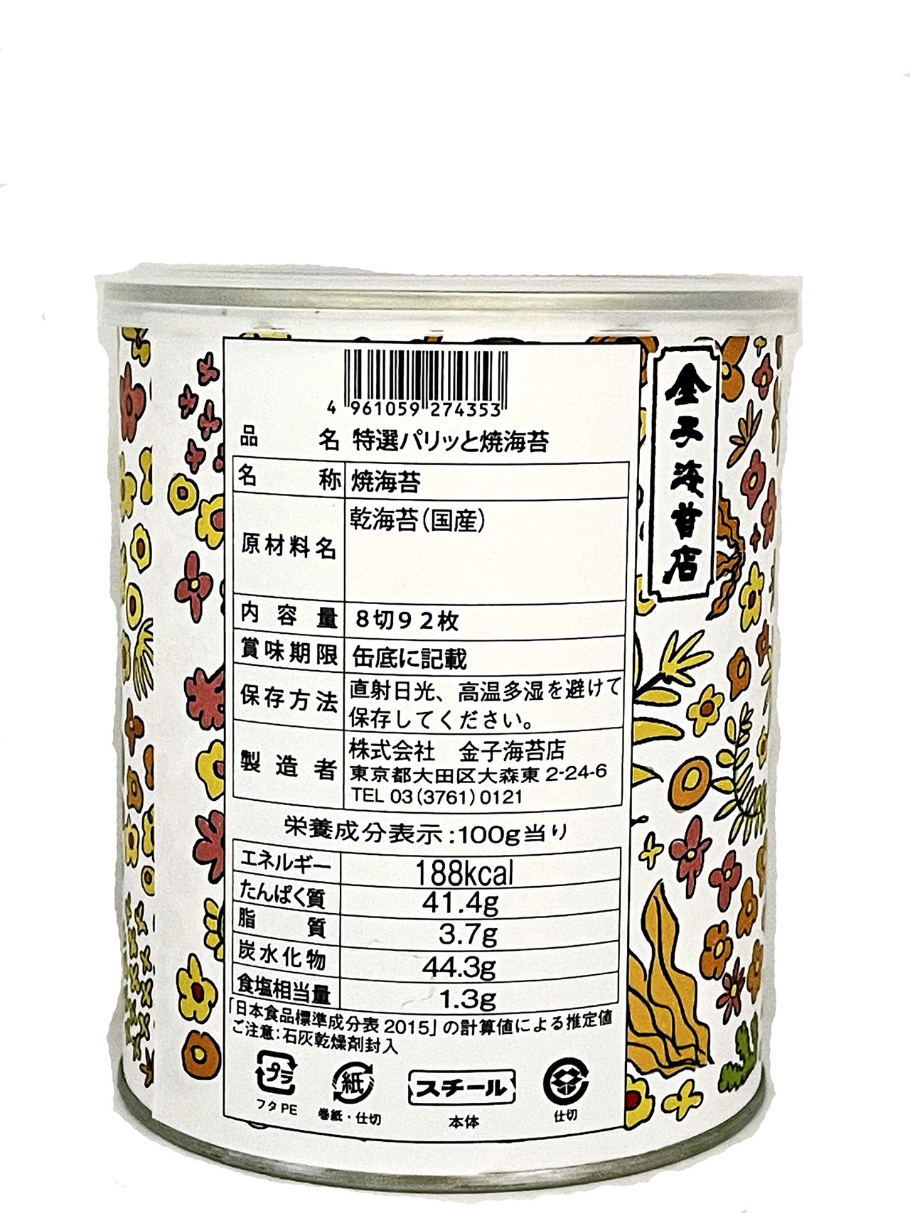 上質の海苔を厳選し、一枚一枚丹念に焼き上げました。食べやすい8切サイズにカットしてあり、ご飯のお供にはもちろん、おやつやおつまみとしてもオススメです。可愛らしい花柄のデザイン缶入りですので、ご自宅用としてはもちろん、手土産・お中元・お歳暮等ご贈答用としてもご好評いただいております。 原材料・成分 乾海苔