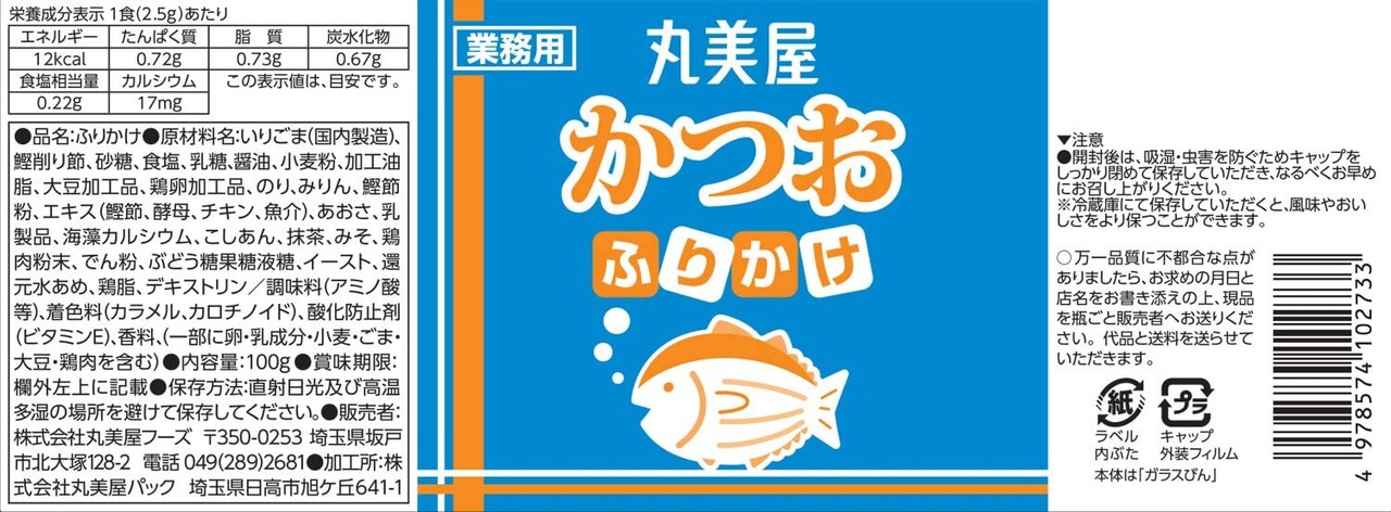 原材料:ごま、鰹削り節、砂糖、食塩、乳糖、醤油、小麦粉、加工油脂、鶏卵加工品、大豆加工品、のり、みりん、エキス(鰹節、チキン、酵母、鰹、魚介)、鰹節粉、あおさ、乳製品、海藻カルシウム、こしあん、抹茶、みそ、鶏肉粉末、でん粉、ぶどう糖果糖液糖、イースト、デキストリン、還元水あめ、鶏脂/調味料(アミノ酸等)、香料、カロチノイド色素、酸化防止剤(ビタミンE)
