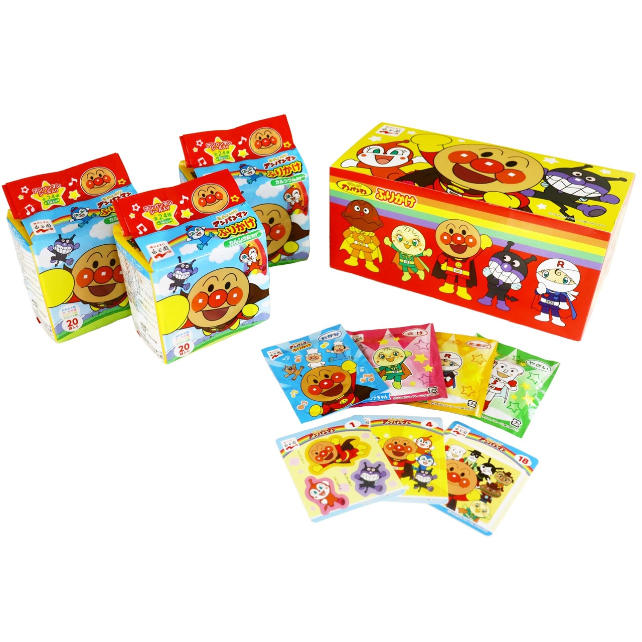 おかか・さけ・たまご・やさいの4種類を詰め合わせたアソートタイプのカルシウム入りふりかけです。 卓上での普段使いや、お弁当にもぴったりです。かわいいアンパンマンキャラクターのシールが3枚付いています。(全24種)