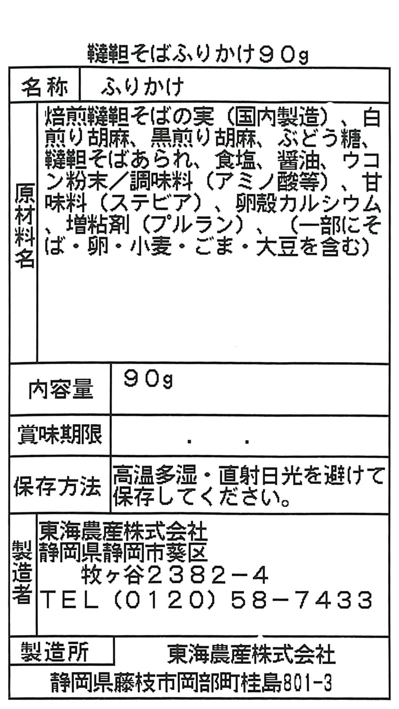 焙煎韃靼そばの実(国内製造)、白煎り胡麻、黒煎り胡麻、ぶどう糖、韃靼そばあられ、食塩、醤油、ウコン粉末/調味料(アミノ酸等)、甘味料(ステビア)、卵殻カルシウム、増粘剤(プルラン)、(一部にそば・卵・小麦・ごま・大豆を含む)
