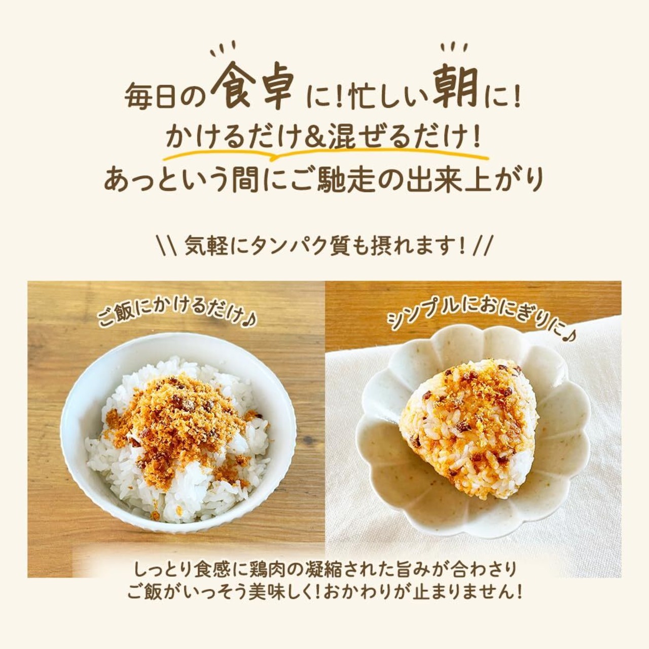 ゆっくり時間をかけて鶏肉を乾燥させ旨みを凝縮させてから、鰹節製造の技術を応用し、丁寧に薄く削ったふわふわの鶏節を、本醸造醤油などこだわりの調味料と合わせじっくりと炊き上げたソフトふりかけです。 化学調味料はもちろん、酵母エキス・着色料・香料・保存料不使用にて旨味たっぷりに仕上げました。 香り豊かで甘みたっぷりの鶏節の旨みが食欲をそそり、ご飯との相性も抜群です。 また、隠し味のごぼうが食感を高めるだけでなく旨みを更に引き立てています。 ご飯や豆腐、サラダにはもちろん、卵焼きやポテトサラダなど、アイディア次第で様々な料理にご活用いただけます。