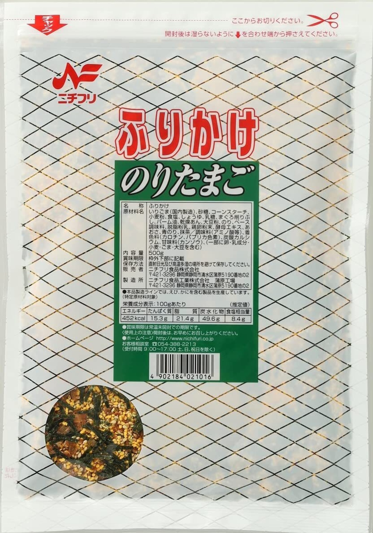 ふりかけの定番の味、のりたまごのふりかけ。業務用サイズの500g入り。保存に便利なチャック付き袋入り。