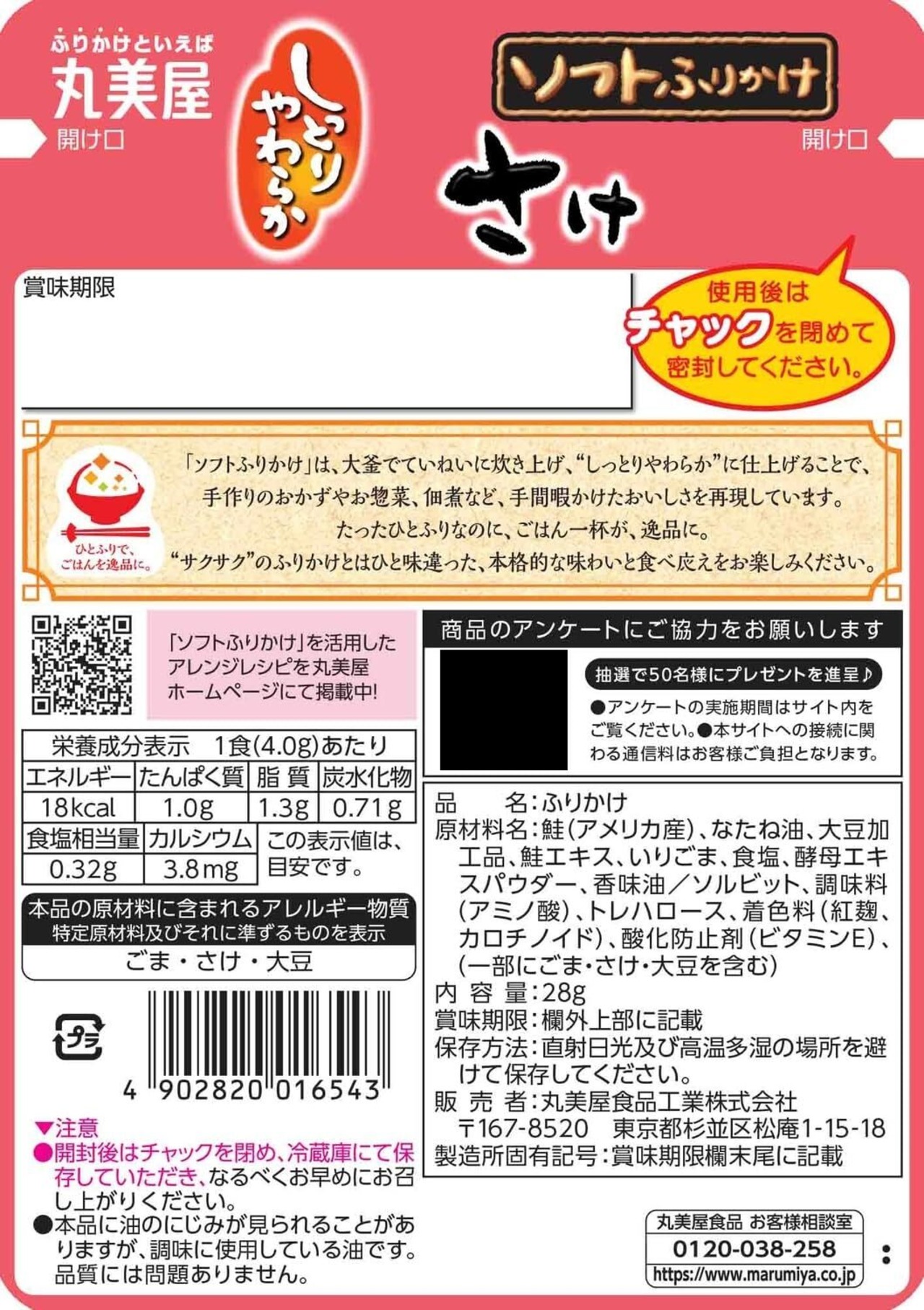 原材料:鮭、なたね油、大豆加工品、鮭エキス、ごま、食塩、酵母エキスパウダー、香味油/ソルビット、調味料(アミノ酸)、トレハロース、着色料(紅麹、カロチノイド)、酸化防止剤(ビタミンE)、(一部にごま・さけ・大豆を含む)