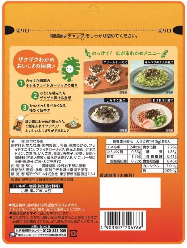 原材料:なたね油(国内製造)、乳糖、乾燥わかめ、フライドオニオン、フライドガーリック、還元水あめ、デキストリン、ごま油、いりごま、食塩、唐辛子、砂糖、山椒//調味料(アミノ酸等)、酸化防止剤(V.E,V.C)、(一部に小麦・乳成分・ごま・大豆を含む)