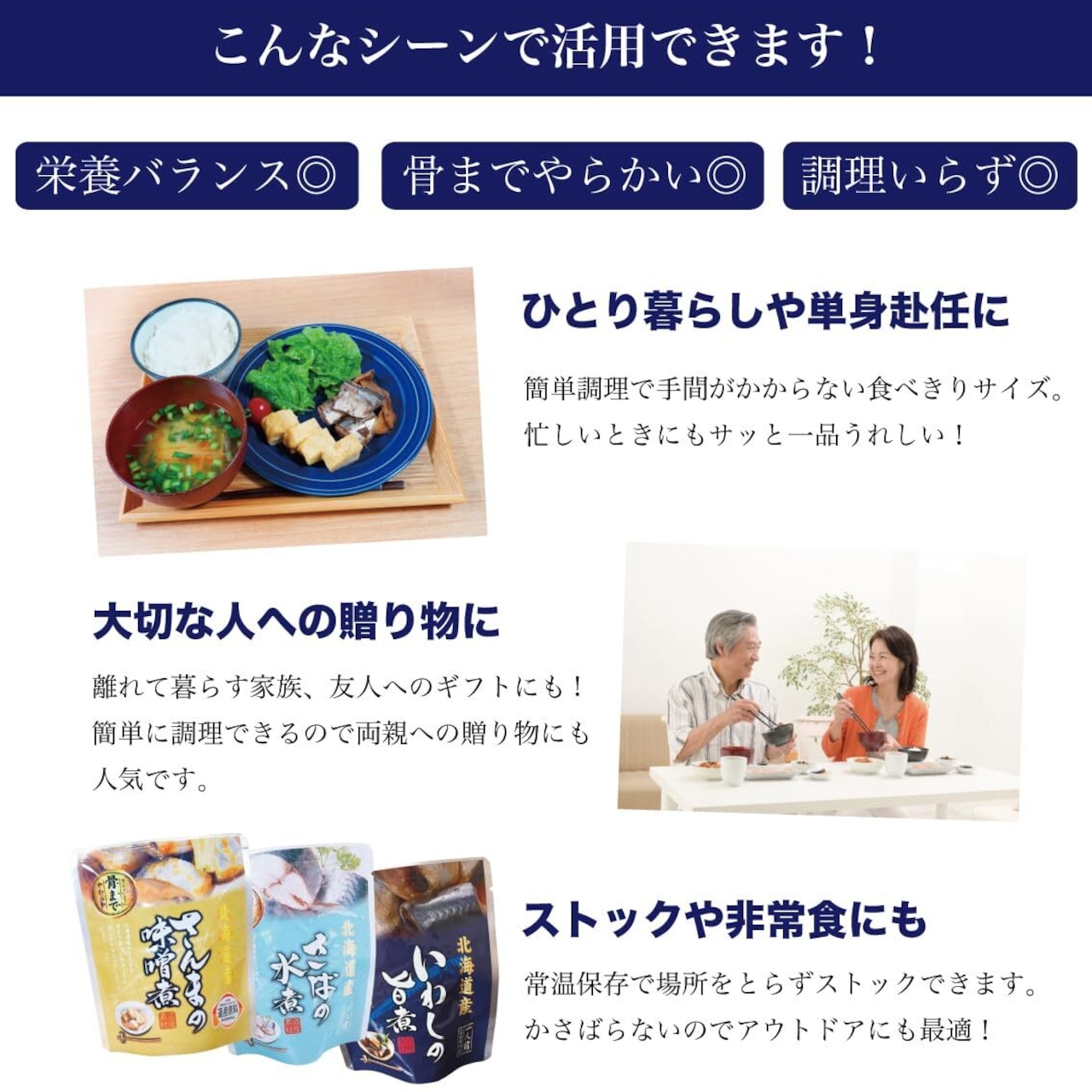 北海道産 の新鮮な 魚介 イワシ サバ サンマ コマイ ホッケ ホタテ を 骨まで食べられる ほど柔らかくじっくりと煮込んだ 兼由 魚のおかず 詰め合わせ セット