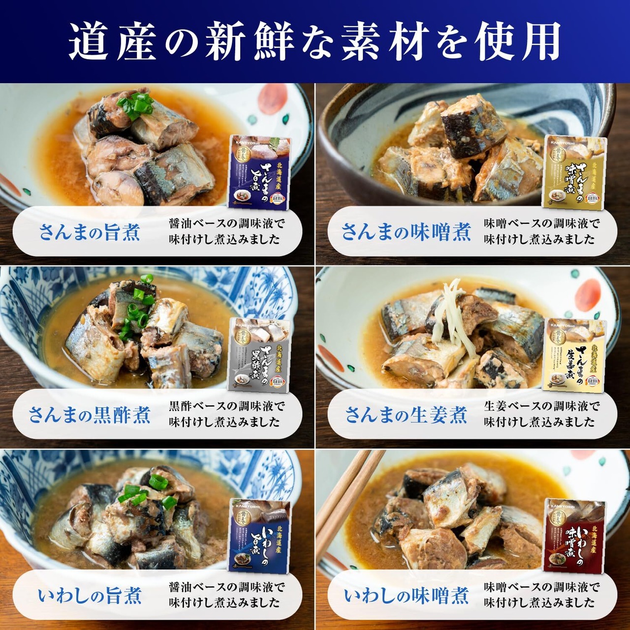 商品に使用している海鮮品:さんま いわし ほっけ さば ほたて こまい 煮付け方法:旨煮 味噌煮 黒酢煮 生姜煮 水煮 バジル バター醤油