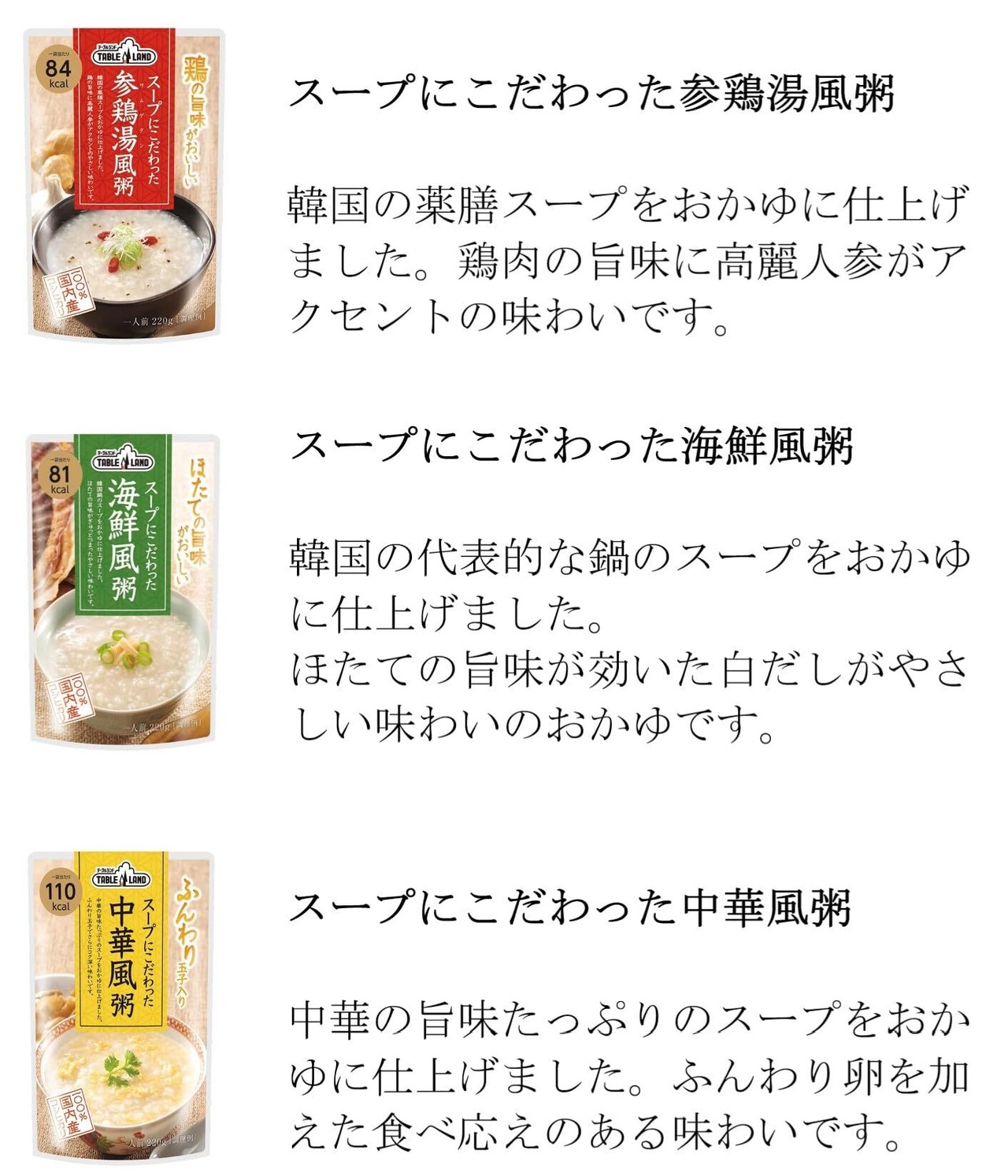 「スープにこだわったお粥シリーズ」3種類と「和風の旨味にこだわったお粥シリーズ」2種類を各2個の10個セットです。