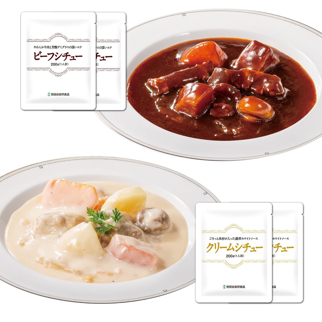 世田谷自然食品 シチュー2種セット 4食入 (2種 × 各2食 200g) 御歳暮 ビーフシチュー クリームシチュー レトルト 具だくさん 野菜 鶏肉 牛肉