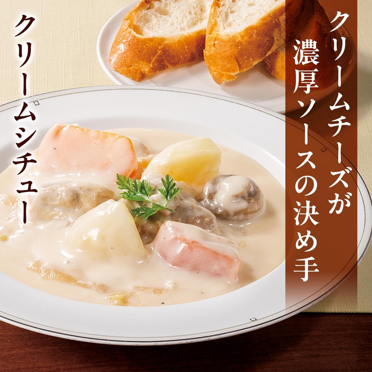 【クリームシチュー】やわらかく煮込んだ鶏肉と、じゃがいも、にんじんなどの具材をたっぷり使用。 野菜のうま味が溶け込んだ濃厚ホワイトソースのおいしさが楽しめる贅沢なクリームシチュー。熟練の料理人が作り上げた当社オリジナル、レトルトタイプの一品です。