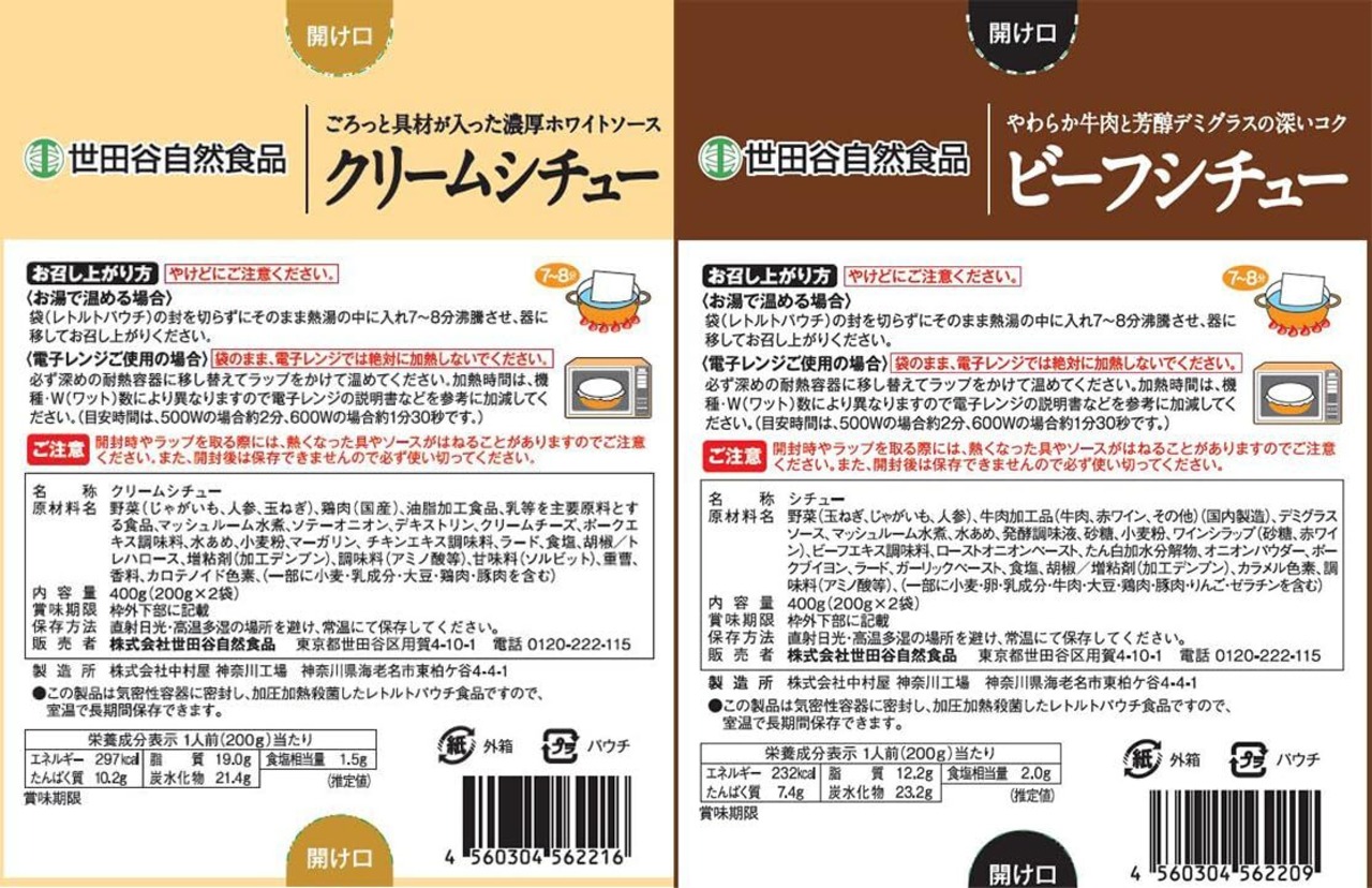 【シチュー2種セットの詳細情報】内容量:4食入(2種×各2食 200g) / アレルギー物質(28品目中):小麦・卵・乳成分・牛肉・大豆・鶏肉・豚肉・りんご・ゼラチン