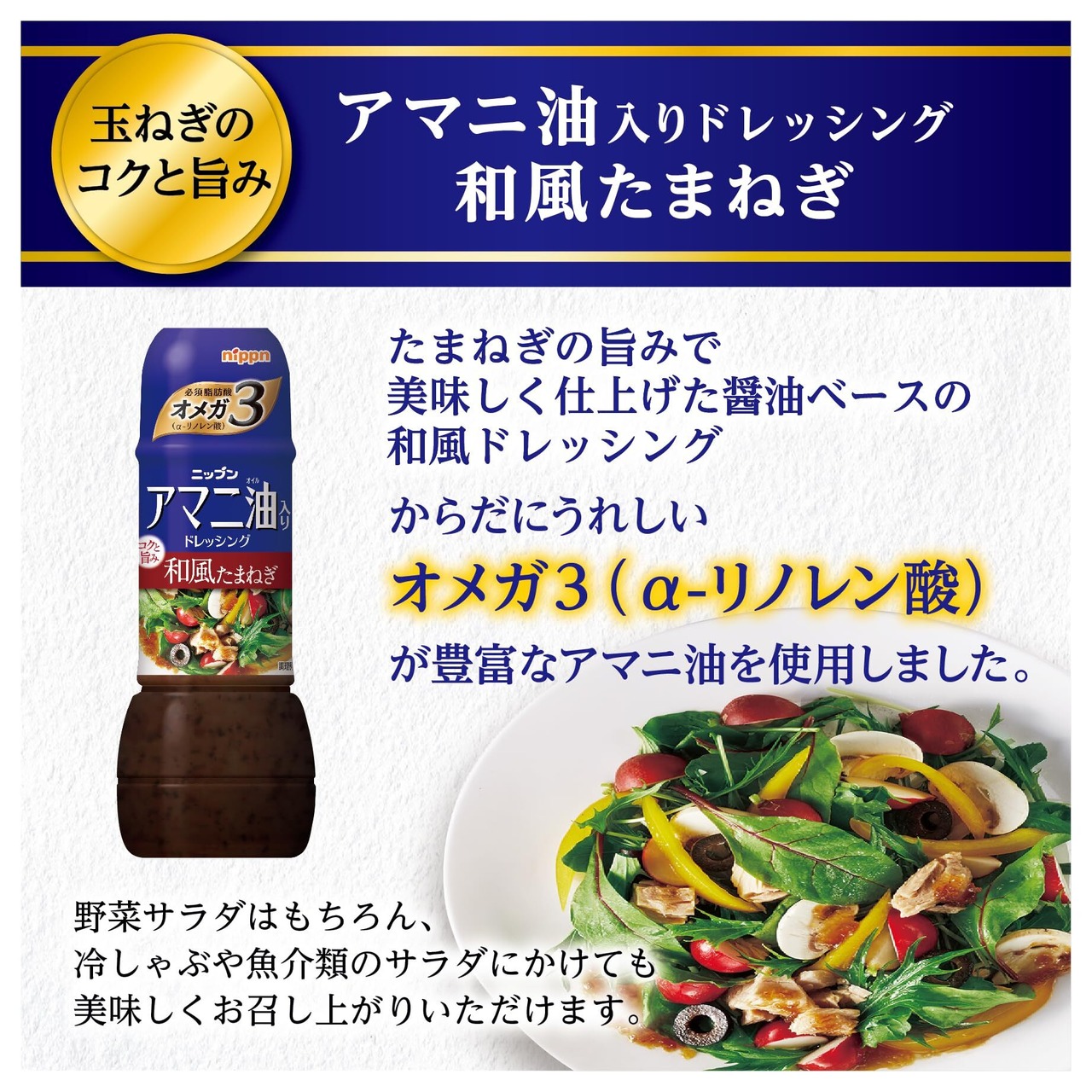 オメガ3(アルファリノレン酸)が豊富なアマニ油を使用し、たまねぎの旨みで美味しく仕上げた、醤油ベースの和風ドレッシングです。