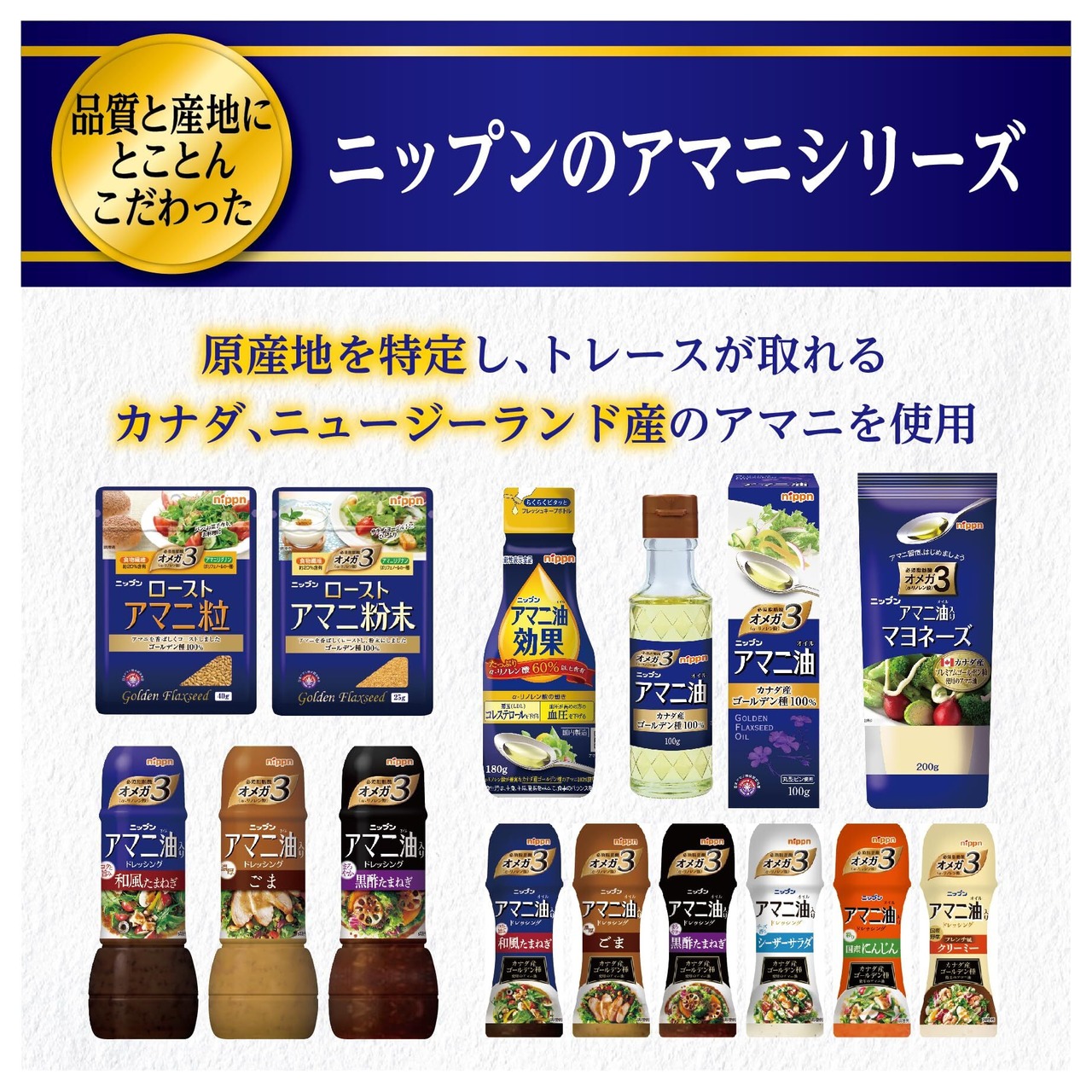 【ニップンのアマニシリーズ】品質と産地にとことんこだわったアマニを使用した様々な商品をご用意。ボトルタイプのアマニオイルからどんな料理にもぴったりのドレッシングまで、お探しの商品がきっと見つかります。