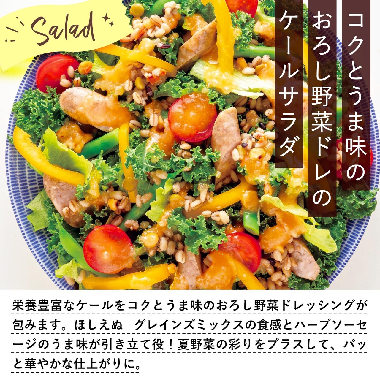 すりおろした野菜(玉ねぎ、にんじん、セロリ、にんにく)のうま味、フルーツ(りんご、パインアップル)の甘味とコクを効かせた濃厚な味わいが特長のドレッシングです。葉野菜等にかけて頂きますと、野菜のおいしさがより一層引き立ちます。