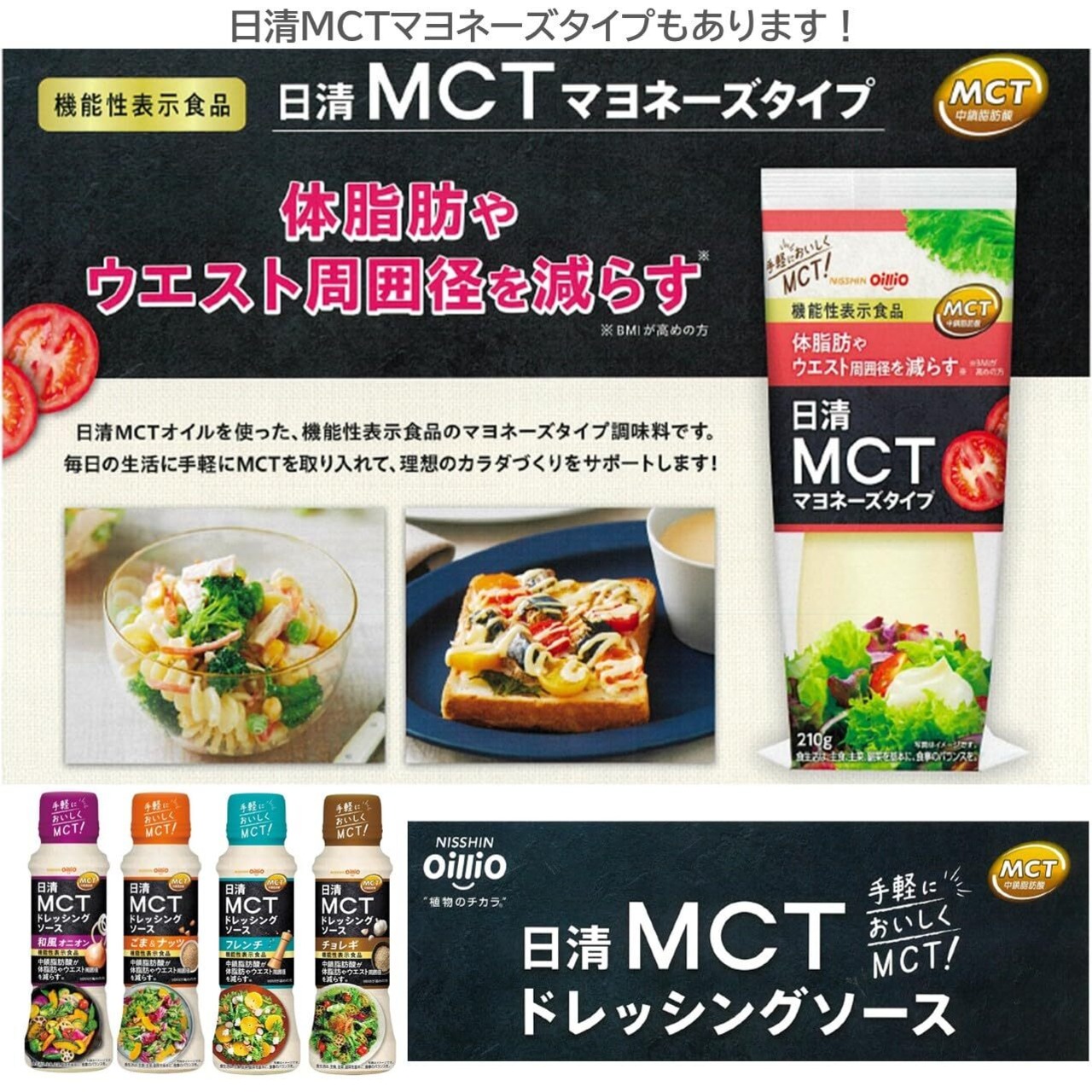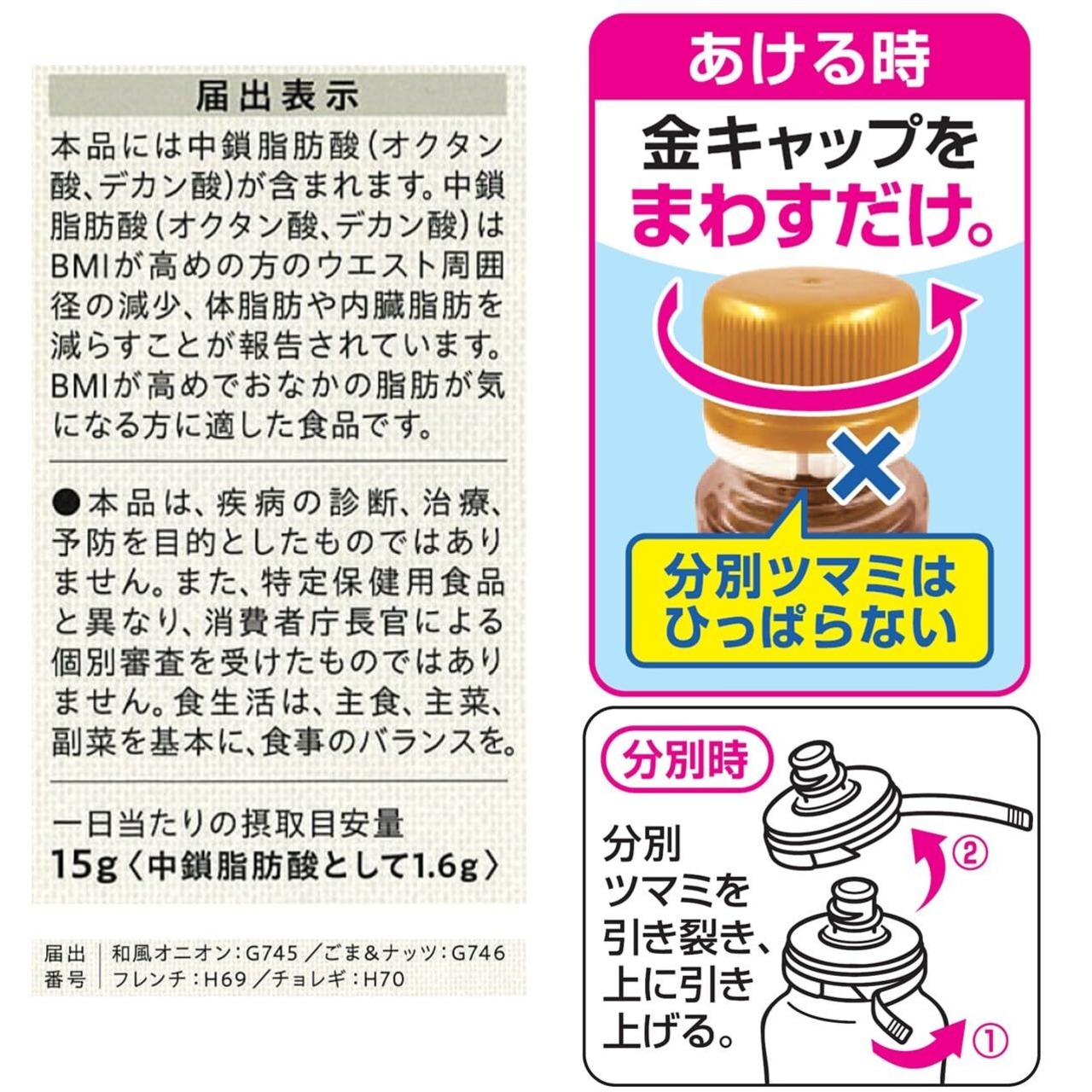 原材料:食用植物油脂(国内製造)(なたね油、ごま油)、果糖ぶどう糖液糖(国内製造)、MCT(中鎖脂肪酸油)、醸造酢、ごま、醤油(小麦、大豆を含む)、アーモンド、にんにく、加工でん粉、増粘剤(増粘多糖類、加工でん粉)、調味料(アミノ酸等)、香料