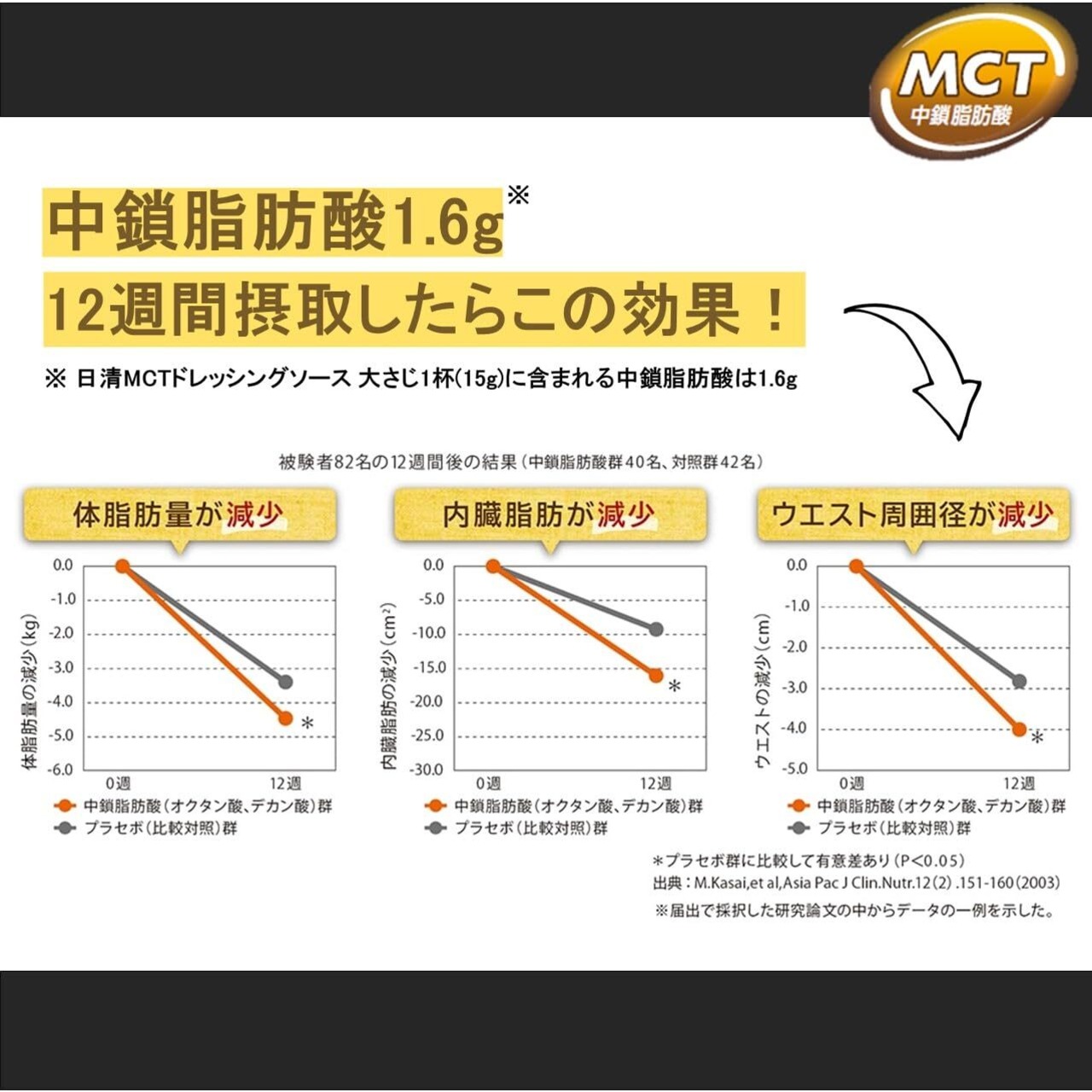 日清MCTオイルを使用することにより、機能性表示食品に認証されたドレッシングソースです。中鎖脂肪酸の働きにより、体脂肪やウェスト周囲経を減らします。香ばしいアーモンドの風味広がる、濃厚なごまドレッシングソースです。具材に絡みやすい乳化タイプドレッシングで、クリーミーなごま風味が特長です。 原材料・成分 食用植物油脂(国内製造)(なたね油、ごま油)、果糖ぶどう糖液糖(国内製造)、MCT(中鎖脂肪酸油)、醸造酢、ごま、醤油(小麦、大豆を含む)、アーモンド、にんにく、加工でん粉、増粘剤(増粘多糖類、加工でん粉)、調味料(アミノ酸等)、香料