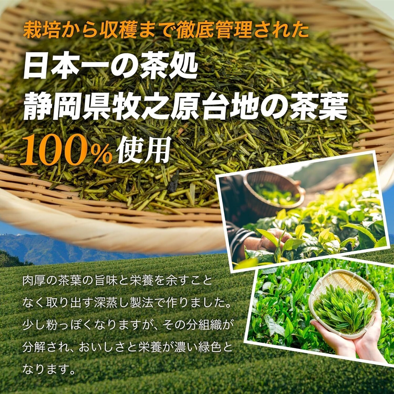 【牧之原台地のお茶】牧之原台地は日照時間が長く、肉厚で栄養たっぷりな茶葉が育ちます。この茶葉を長く蒸すことで、タンニン(苦渋味)含量が減り、アミノ酸のテアニン(甘み)が増してまろやかなお茶に仕上がります。茶葉は細かくなりますが、きれいな深いグリーン、まろやかな甘味と深いコクが特徴です。