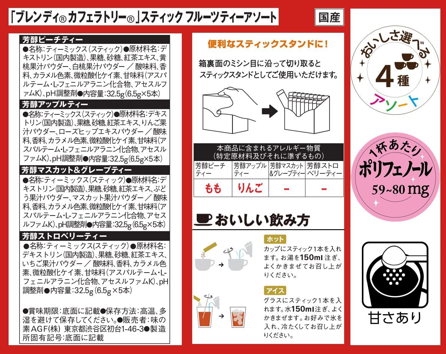 AGF(エージーエフ) 「ブレンディカフェラトリー」 スティック フルーツティーアソート20本 は、ピーチティー、アップルティー、マスカット&グレープティー、ストロベリーティーの4品種のこだわりの果実と紅茶の豊かな味わいを気分や好みに合わせて楽しめる贅沢フルーツティーアソートパックです。1杯1杯がいつも新鮮な個包装スティックタイプ。
