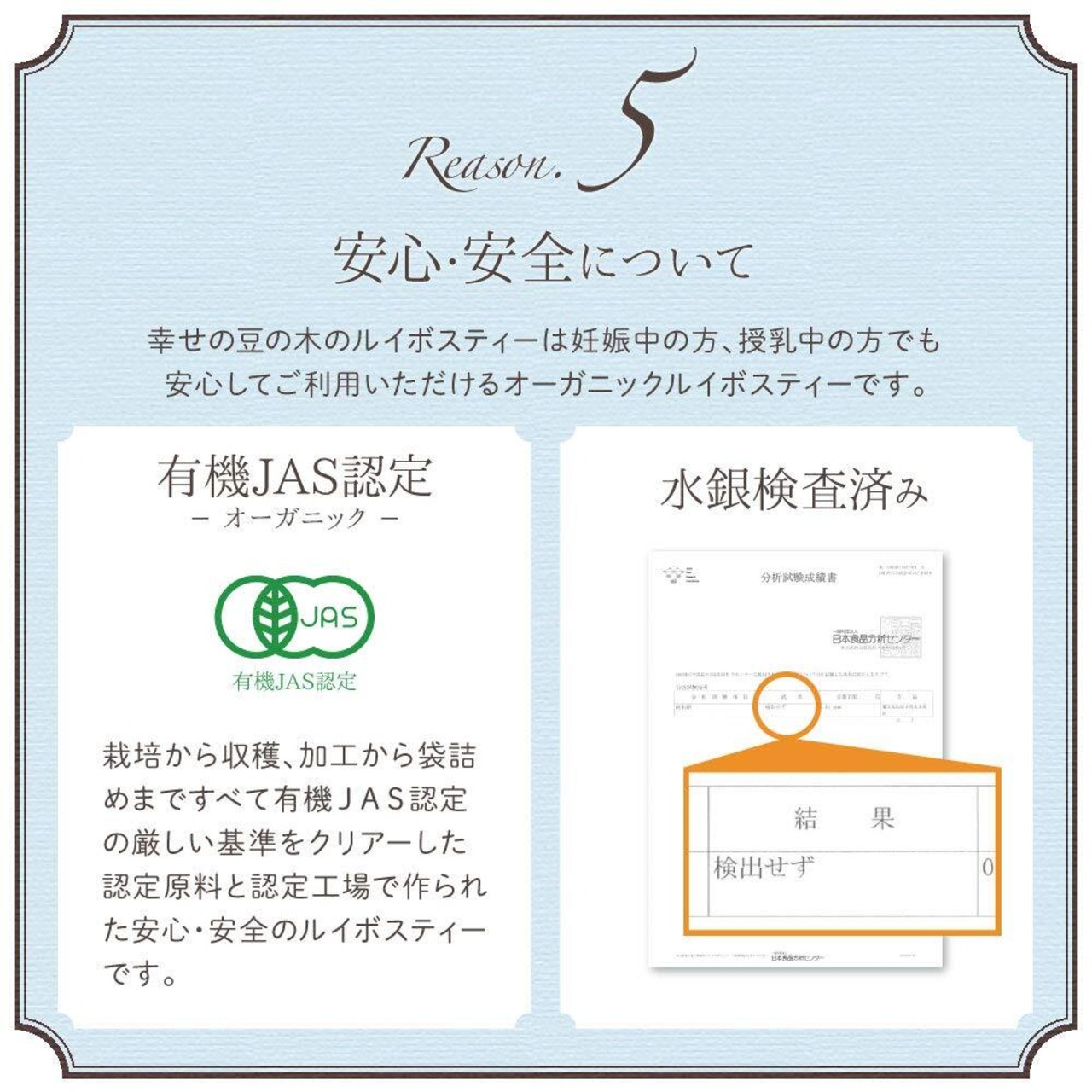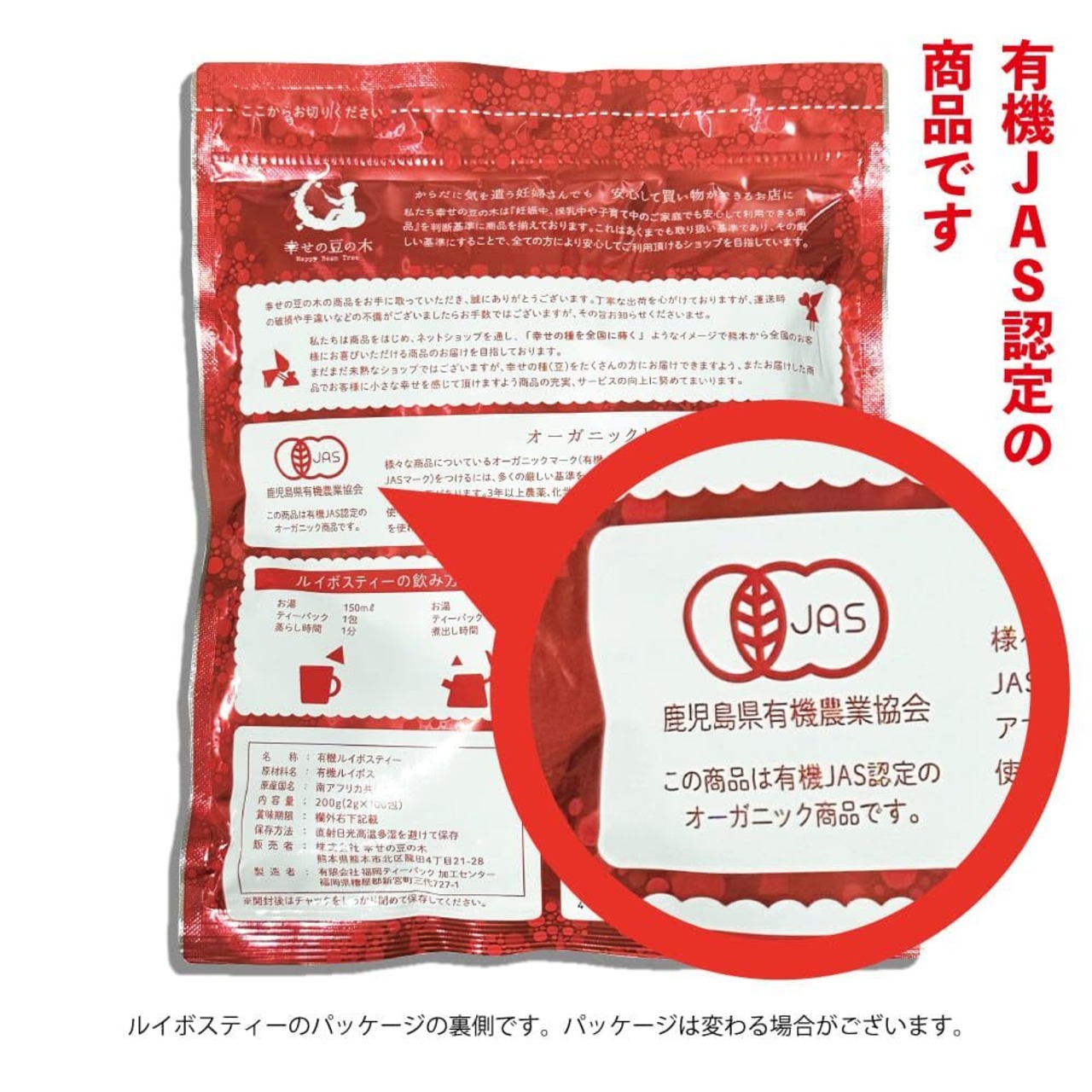 【ルイボスティーの人気の秘密】幸せの豆の木のルイボスティーは高品質なオーガニック。オーガニックルイボスティーは全体の5%程度しかなく大変貴重なルイボスティーです。化学肥料や農薬など使わない安心・安全のルイボスティーは妊婦さんや授乳中の方でも安心してご利用頂け、健康意識の高い方にも非常に人気の商品です。