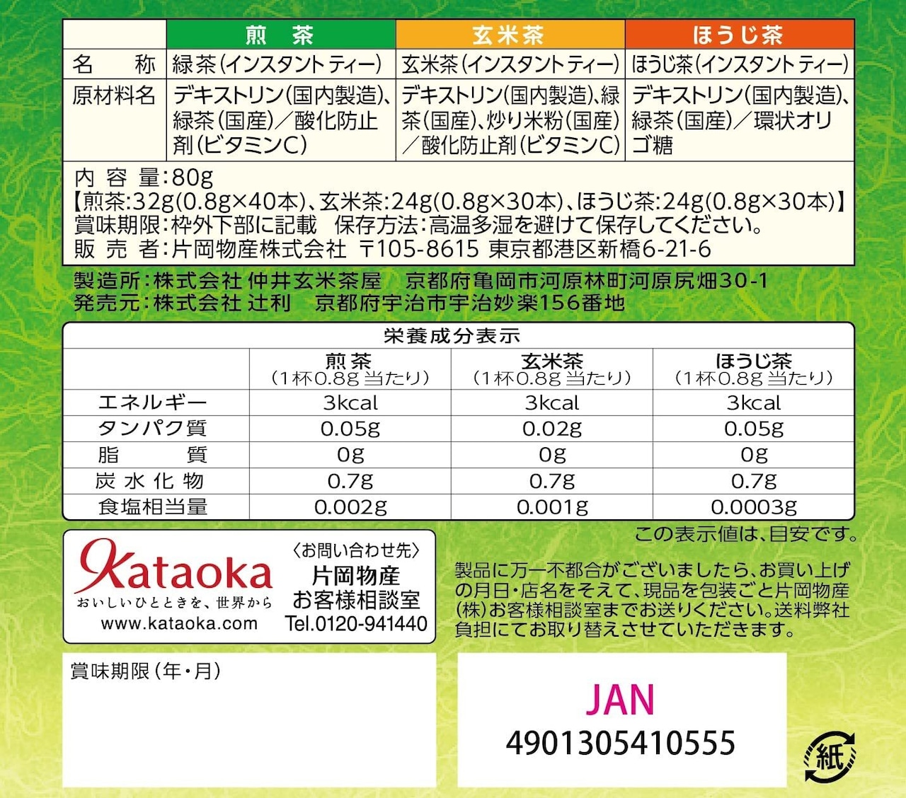 原材料:煎茶:デキストリン、緑茶(国産)、酸化防止剤(ビタミンC) 玄米茶:デキストリン、緑茶(国産)、炒り米粉(国産)、酸化防止剤(ビタミンC) ほうじ茶:デキストリン、緑茶(国産)、環状オリゴ糖