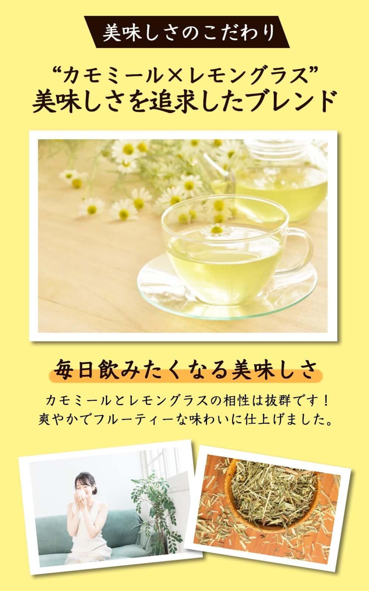 【20種類以上の栄養成分】カモミールとレモングラスを絶妙なバランスでブレンドしたことで、上品な味わいに仕上がっています。健康維持の強い味方としても愛飲されています。