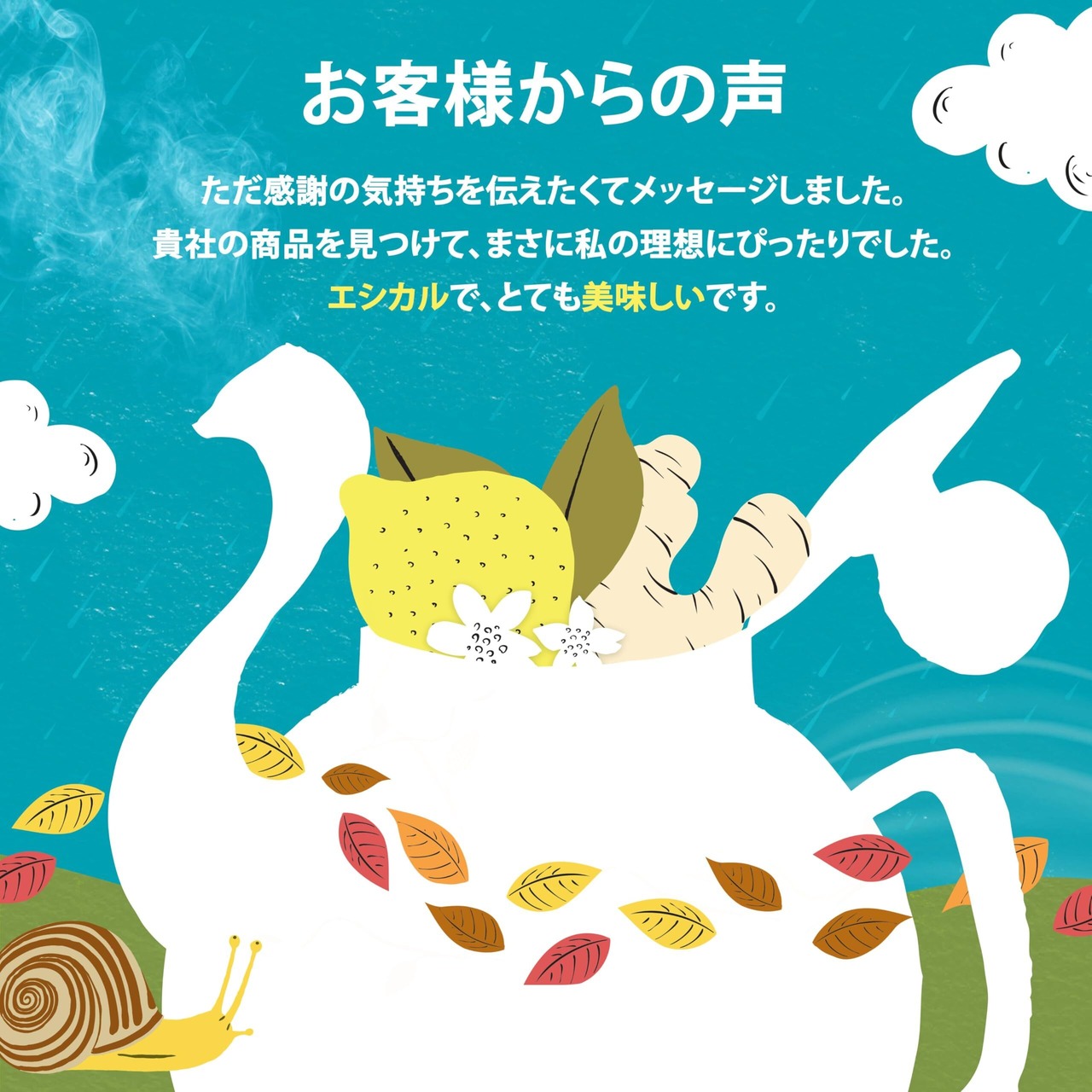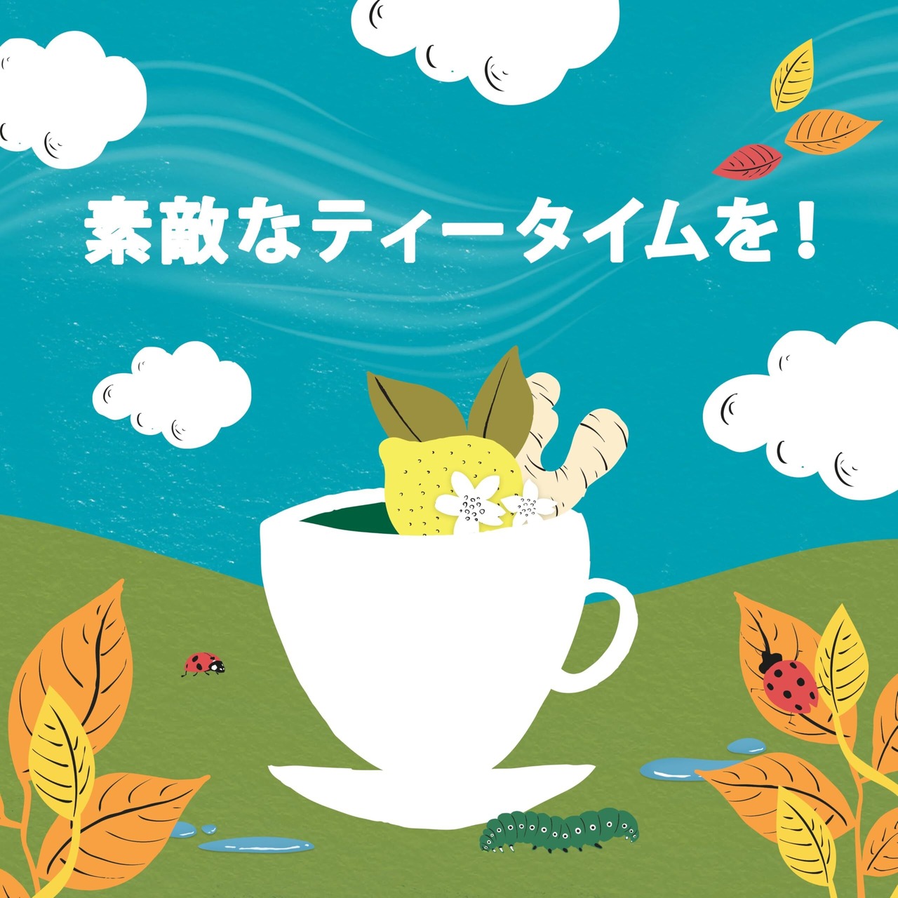 オーガニックハーブティー。ピリッとしたジンジャーとレモングラス、リコリス、レモンの皮をブレンドしたオーガニックハーブティー。ほんのりとした甘みとレモンの酸味が特徴です。天然香料使用。カフェインフリー。無漂白ティーバッグ使用。