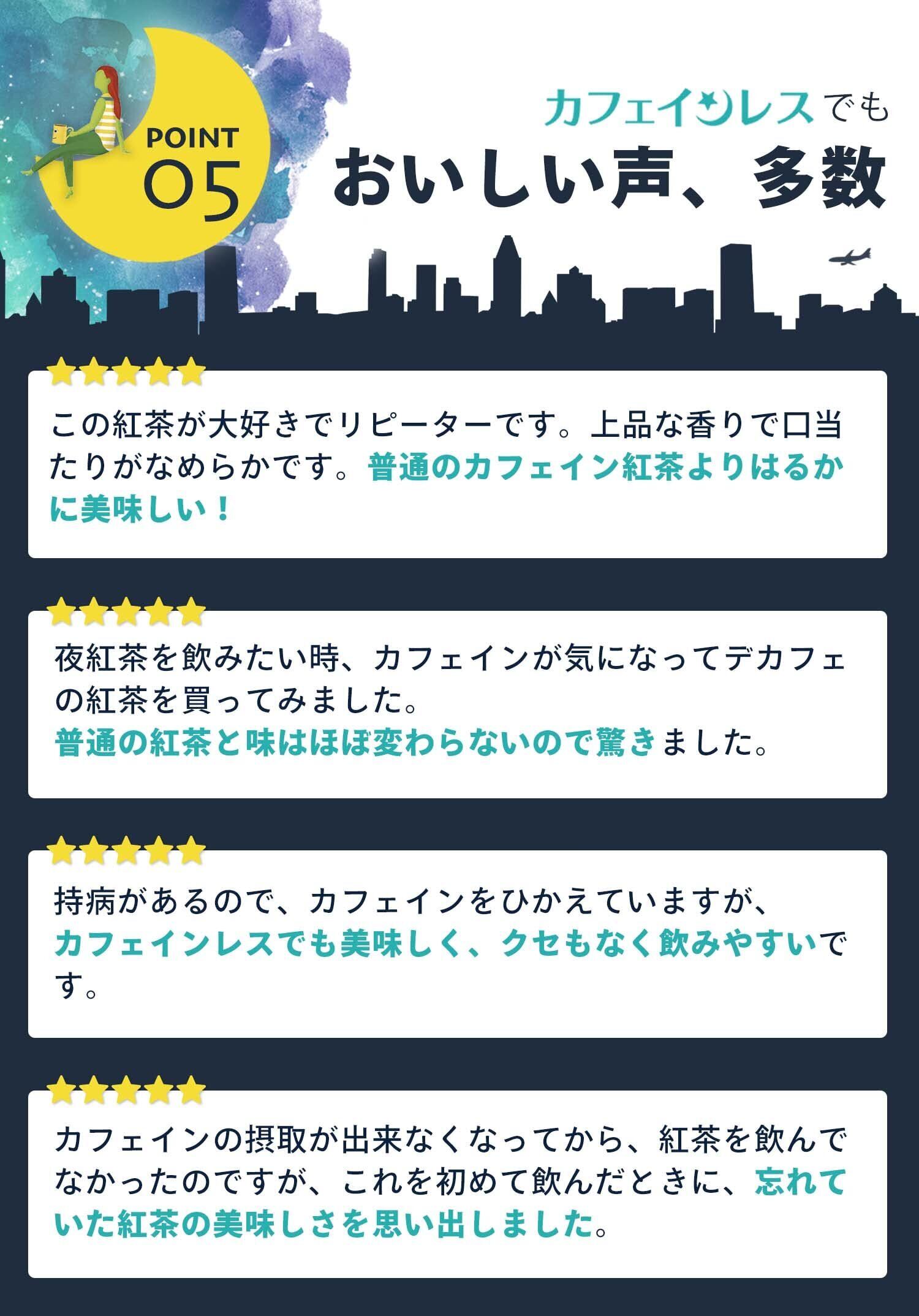 おいしさをできるだけ保ちながら、できる限りカフェインを取り除いています。赤りんごの果実感たっぷりの甘い香りを楽しめる本格紅茶。
