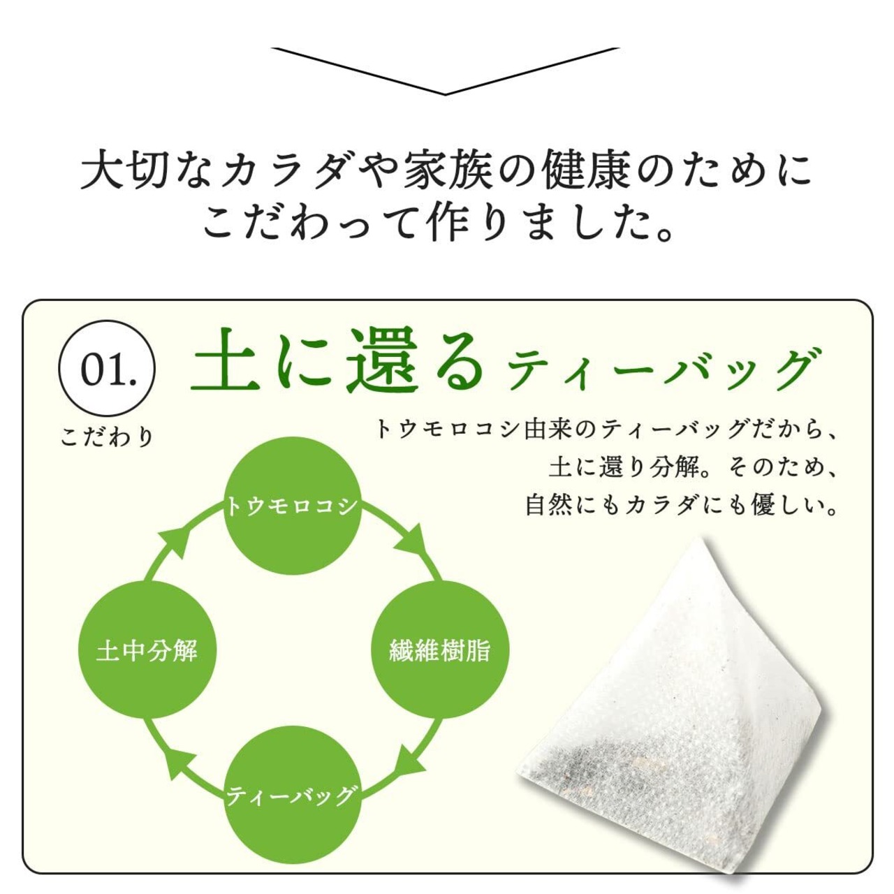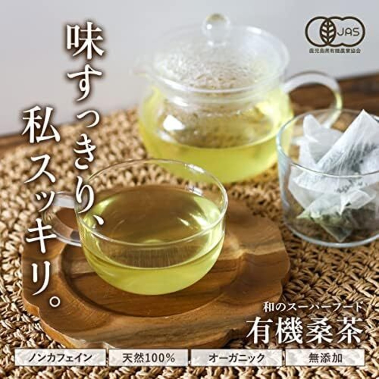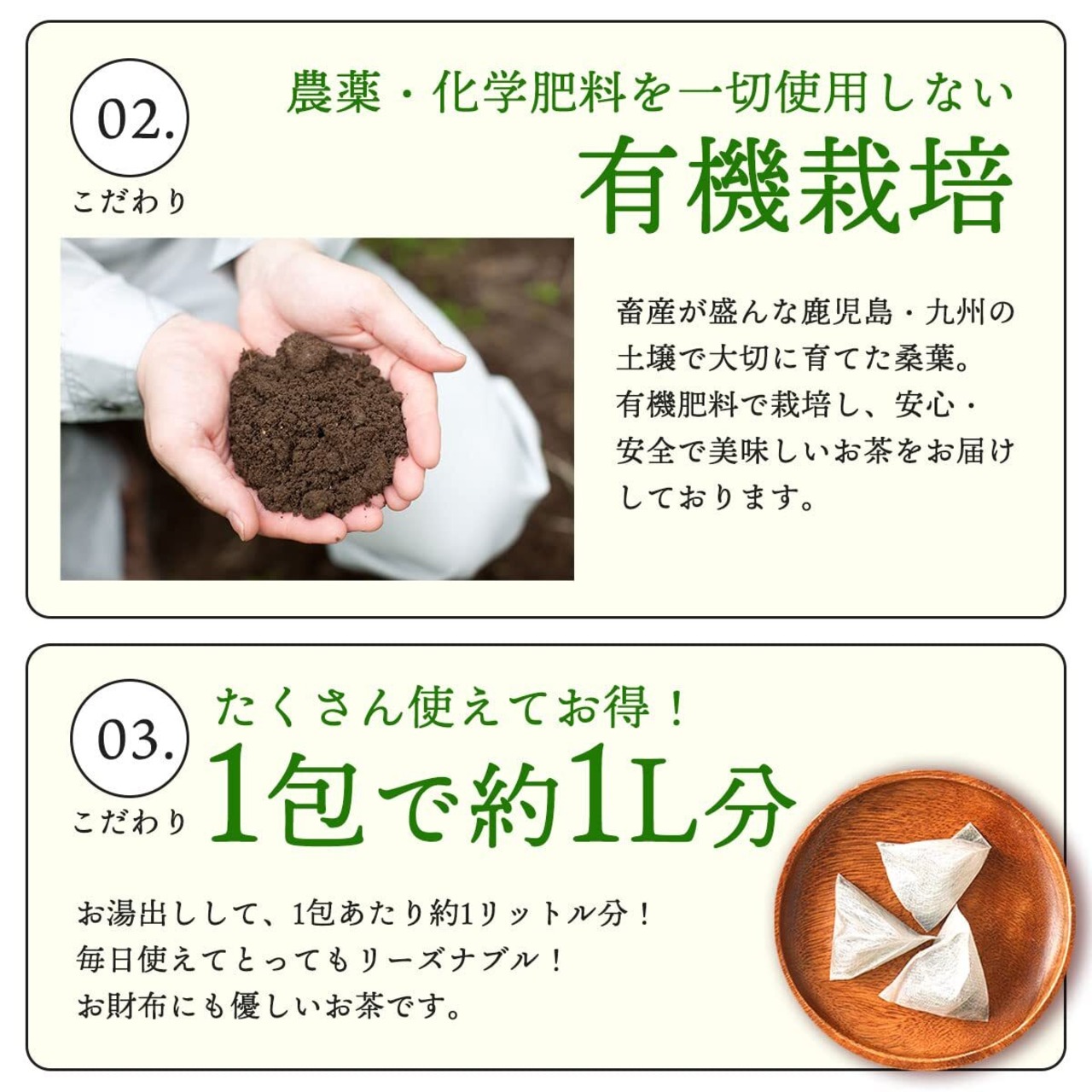 ■健康的に美しくダイエットをサポートする桑の葉が注目されています。 本来の美しさを引き出す「12種類以上の栄養を含む桑」 桑の葉に含まれる成分は多岐にわたります。 1-デオキシノジリマイシン/カリウム/カルシウム/食物繊維/ビタミンE/鉄分/亜鉛/必須アミノ酸/ポリフェノール/葉酸/ビタミンA/マグネシウム■大切なカラダや家族の健康のためにこだわって作りました。 ・自然に還るティーバッグ トウモロコシ由来のティーバッグだから、土に還り分解。 そのため自然にもカラダにも優しい ・農薬・化学肥料を一切使用しない有機栽培 畜産が盛んな鹿児島・九州の土壌で大切に育てた桑葉。 有機肥料で栽培し、安心安全で美味しいお茶をお届けします。