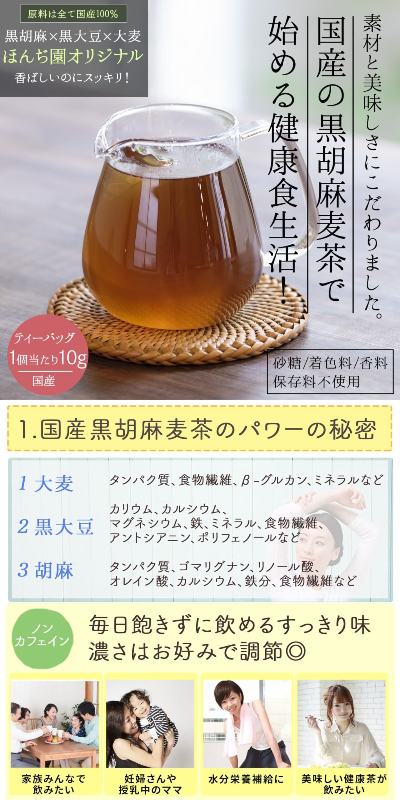 こだわりの国産の大麦・黒大豆・黒胡麻を飲みやすくブレンドした香ばしいお茶です。ノンカフェインでホットでも冷やしても美味しいです。