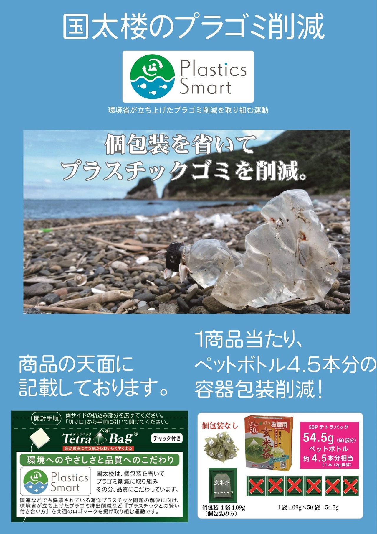 色のよい粉末茶、味の濃い深蒸し茶に香りのよい玄米をブレンドしました。こうばしい香りをより高めた味わいがお楽しみいただけます。国産茶葉100%使用し、個包装を省いた環境省が推奨するプラスチックスマートティーバッグ商品で簡単、便利、おいしい、エコを兼ね備えたお徳用玄米茶ティーバッグ。