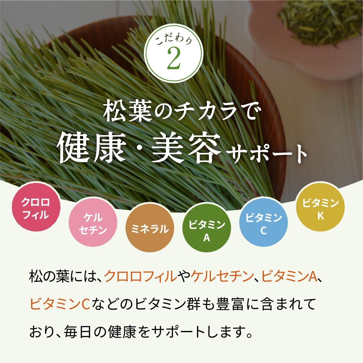 【国産100%松葉茶】国産の自生赤松の葉と軸をまるごと焙煎。風味豊かな味わいに仕上げました。ノンカフェイン、ノンカロリーのお茶だから、どんな時も気にせずお飲みいただけます。