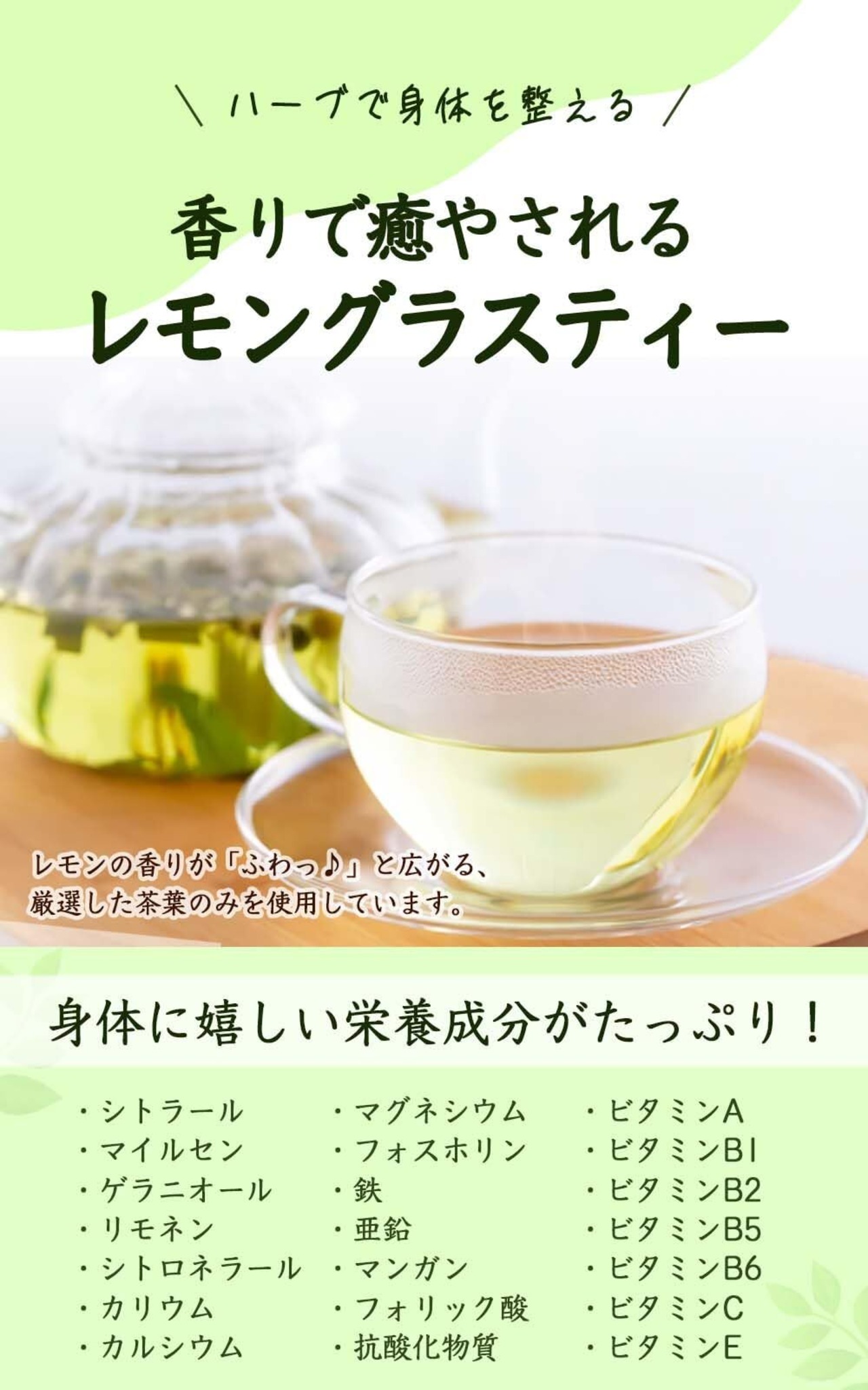 【厳選レモングラスティー】熊本県産のレモングラスを使用したレモングラスティーです。レモングラスの爽やかな香りに、グリーンルイボスをブレンドしたことで豊かな味わいに仕上がりました。