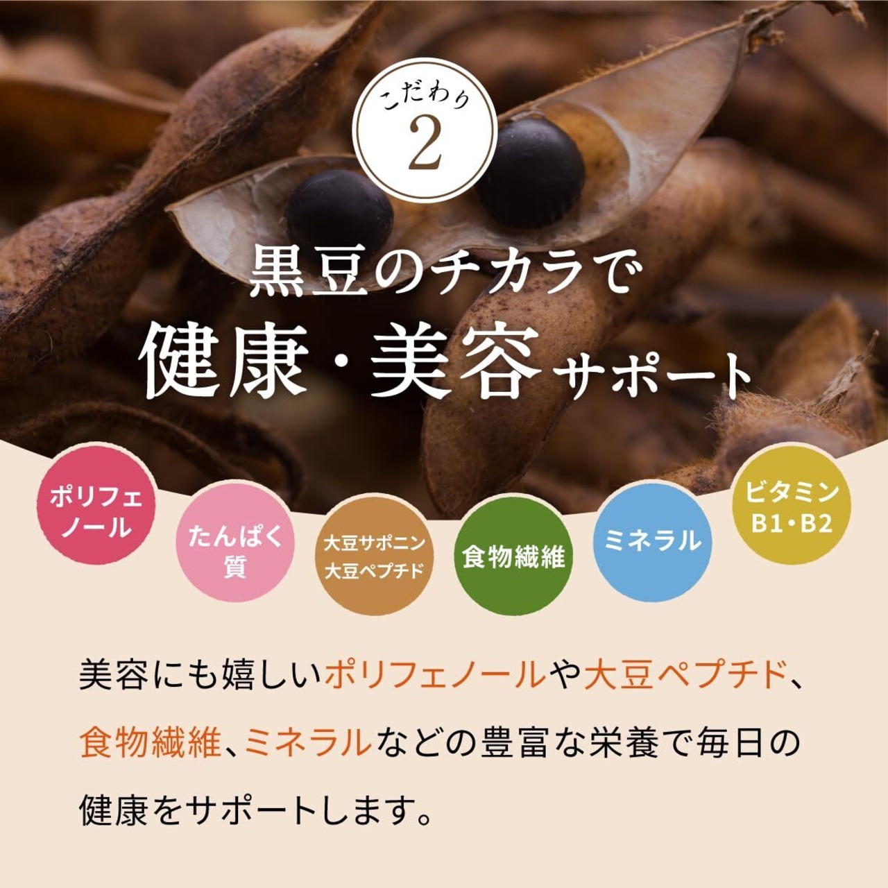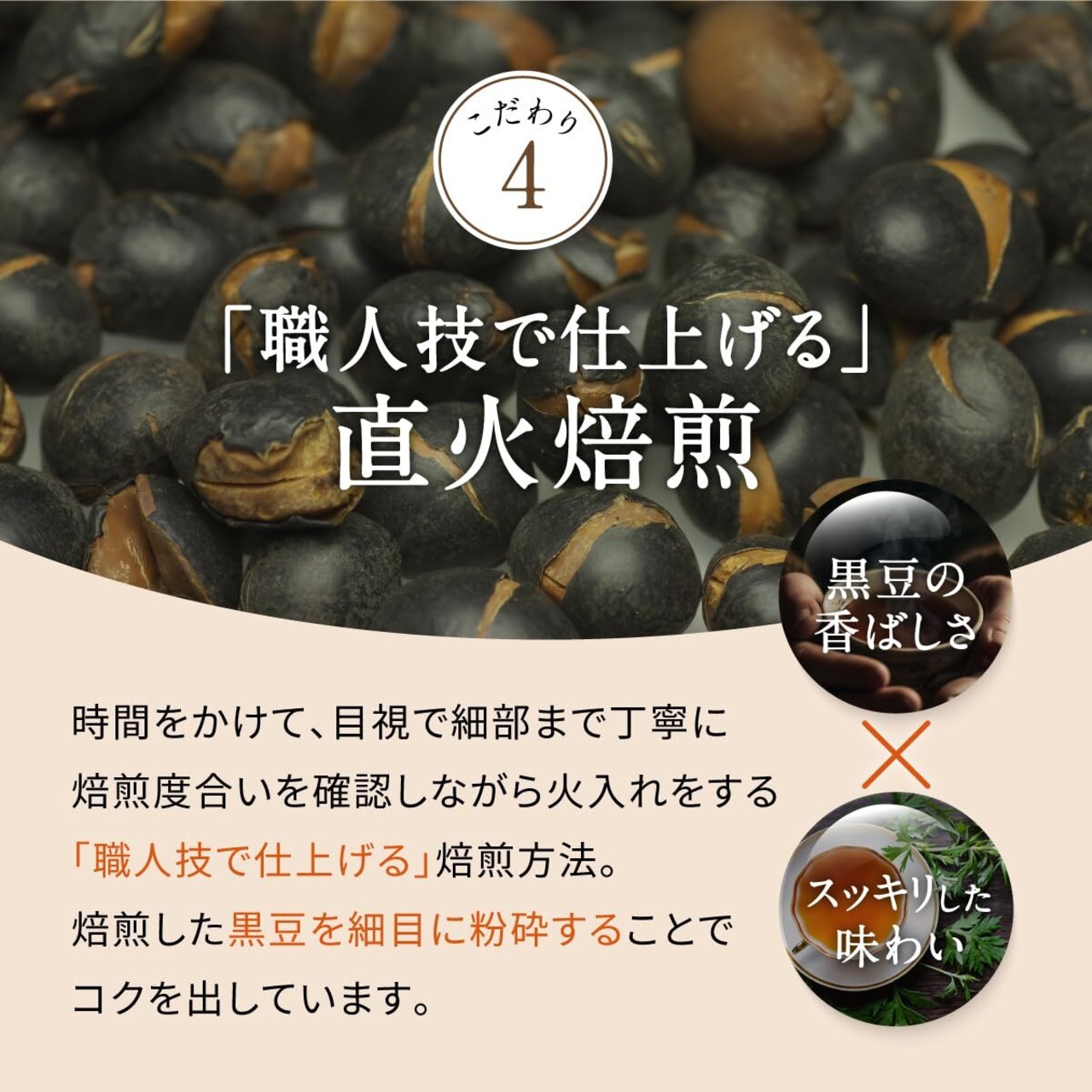 【おいしさ・飲みやすさの追求】おいしさと飲みやすさを追求した結果、「直火焙煎」を行い、丁寧に焙煎度合いを確認しながら火入れを行います。焙煎した黒豆を細目に粉砕す ることで、コクと旨味を引き出し、すっきりと香ばしいお茶に仕上げました。