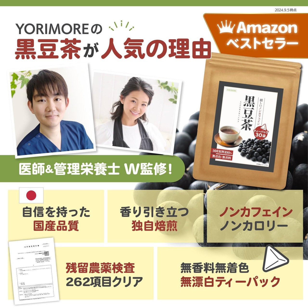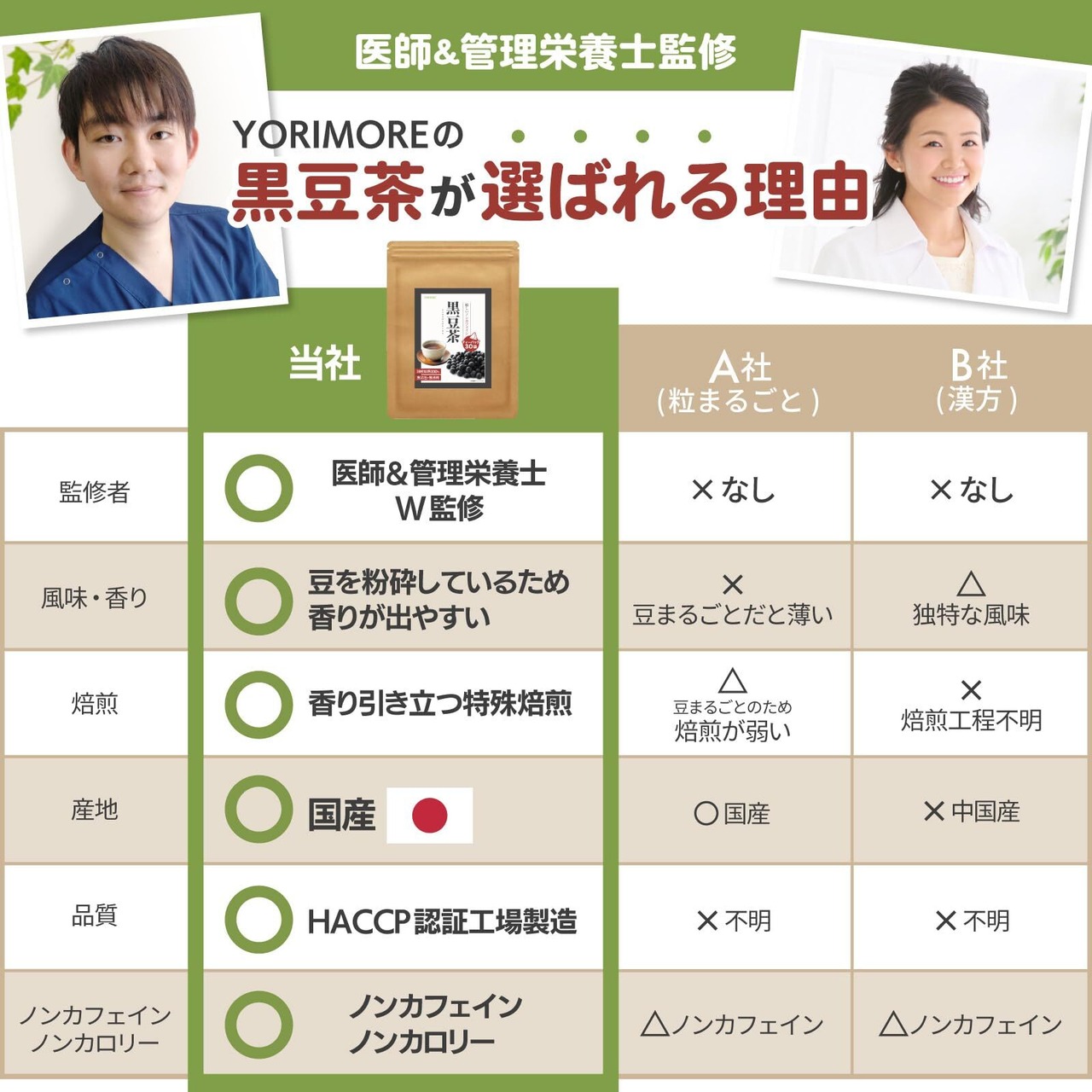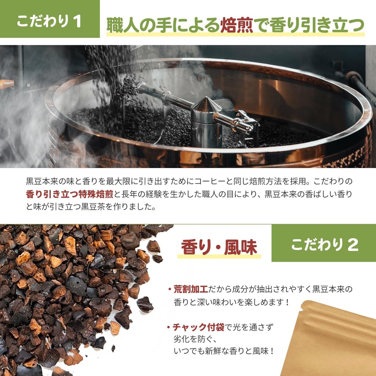 【国産・国内製造】YORIMOREの黒豆茶は、日本国内で栽培から収穫、加工製造まで徹底された品質管理の上、厳選された黒豆を使用しています。