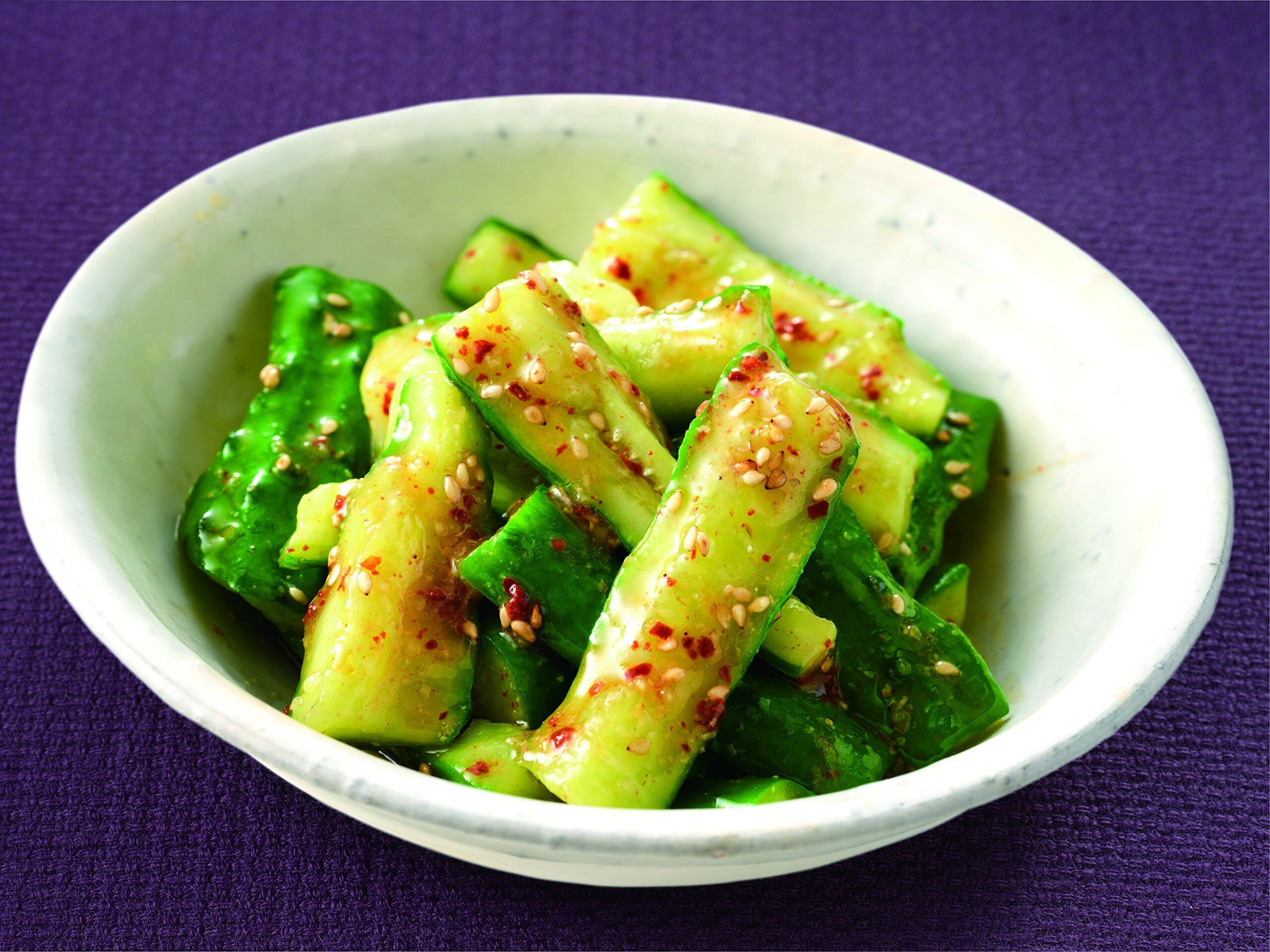 たたいて割いたきゅうりにごま油とシーズニングをあえるだけ。