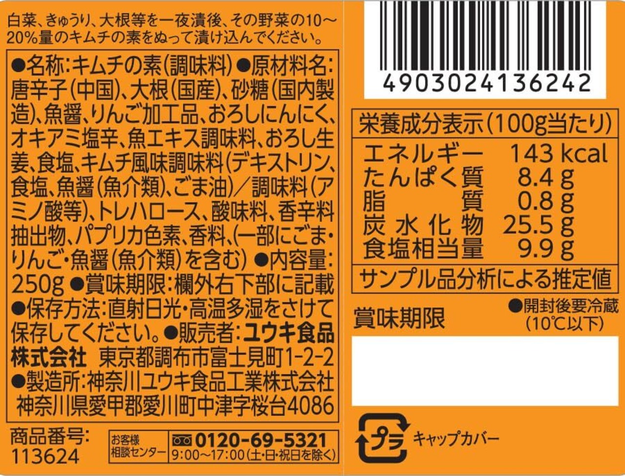 唐辛子(中国)、大根(国産)、砂糖(国内製造)、魚醤、りんご加工品、おろしにんにく、オキアミ塩辛、魚エキス調味料、おろし生姜、食塩、キムチ風味調味料(デキストリン、食塩、魚醤(魚介類)、ごま油)/調味料(アミノ酸等)、トレハロース、酸味料、香辛料抽出、パプリカ色素、香料、(一部にごま・りんご・魚醤(魚介類)を含む)