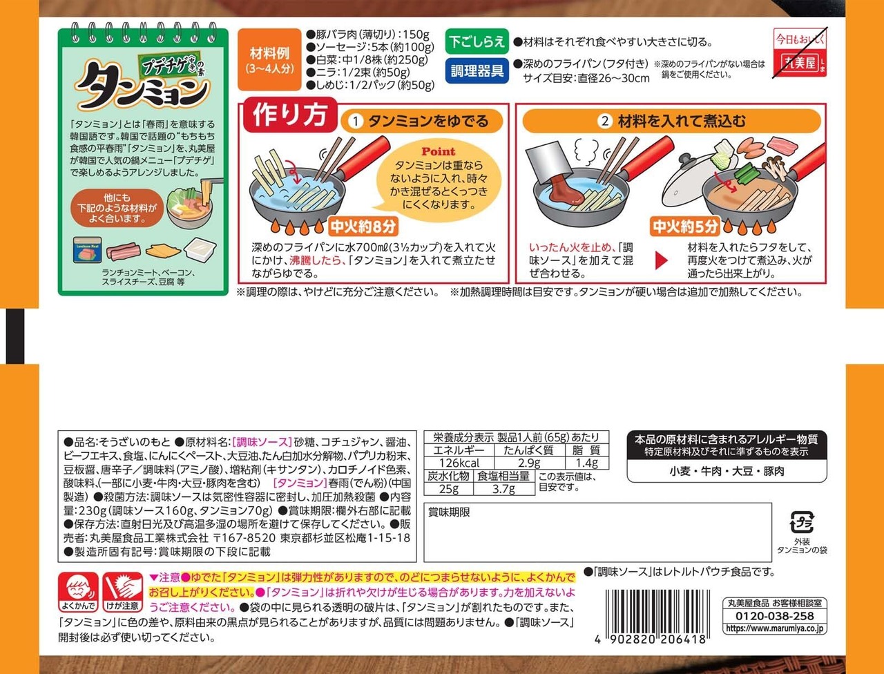 [調味ソース]砂糖、コチュジャン、醤油、ビーフエキス、食塩、にんにくペースト、大豆油、たん白加水分解物、パプリカ粉末、豆板醤、唐辛子/調味料(アミノ酸)、増粘剤(キサンタン)、カロチノイド色素、酸味料、(一部に小麦・牛肉・大豆・豚肉を含む)| [タンミョン]春雨(でん粉)(中国製造)