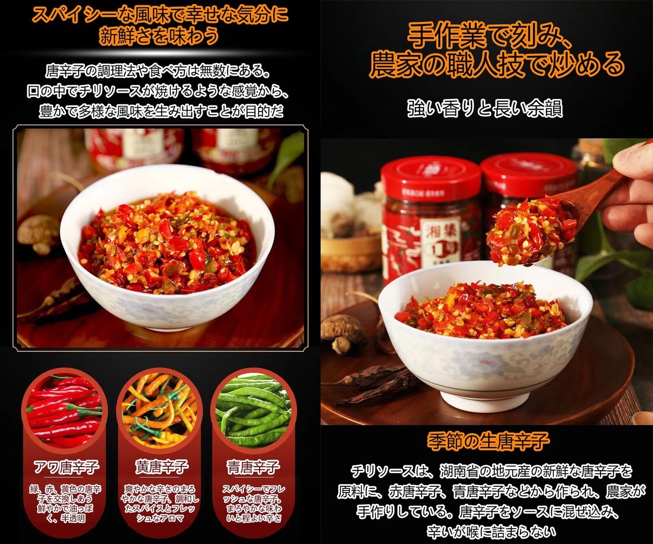 【厳選素材】旬の新鮮な唐辛子を原料に選び、製造過程では原料の品質と製造工程を厳しく管理し、商品の品質と味をしています。旬の新鮮な唐辛子は味が良く、チリソースにより強い辛さと豊かな香りをもたらすことができます。豊かな風味と香りだけでなく、原材料に旬の新鮮な唐辛子を使用し、原材料や製造工程の品質管理にも力を入れていますので、安心してお召し上がりいただけます。
