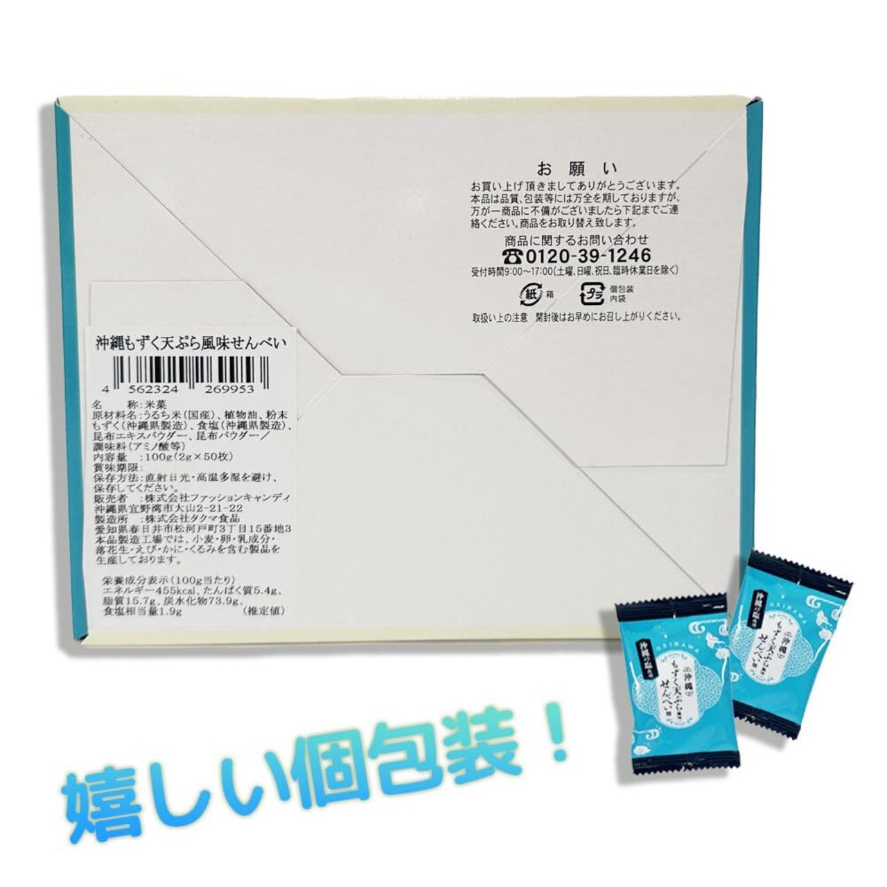 栄養成分:【沖縄もずく天ぷら風味】(100g当たり) エネルギー 455kcal / たんぱく質 5.4g / 脂質 15.7g / 炭水化物 73.9g / 食塩相当量 1.9g(推定値)