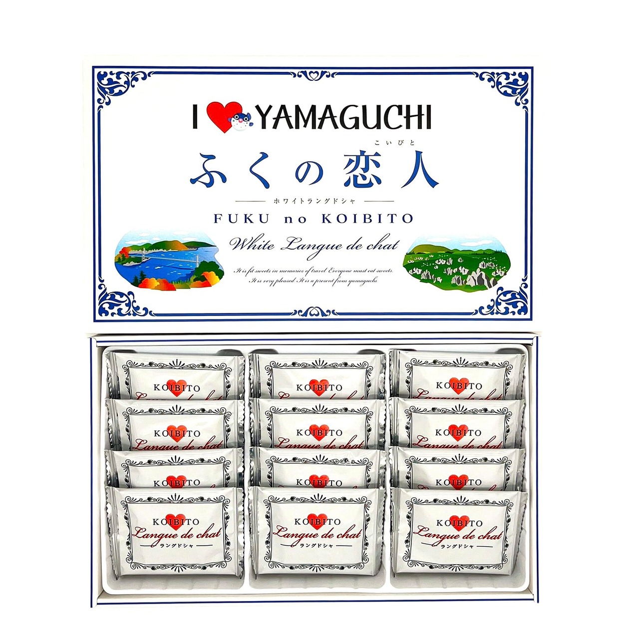 「ふくの恋人」は、シンプルなホワイトチョコのラングドシャです。サクサクとしたラングドシャ生地に、滑らかなホワイトチョコレートがサンドされています。ほんのりとレモン果汁が加わっており、気づかないほどの絶妙なバランスが特徴です。いつ食べても安定して美味しいお菓子です。 山口県下関の名物「ふぐ」を「幸福」につながることからも下関では「ふく」と呼んでいます。