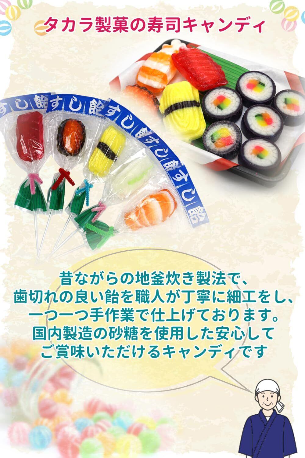 タカラ製菓の寿司キャンディ 。昔ながらの地釜炊き製法で、歯切れの良い飴を職人が丁寧に細工をし、 一つ一つ手作業で成形型に入れプレスし仕上げております。 国内製造の砂糖を使用した安心してご賞味いただけるキャンディです。