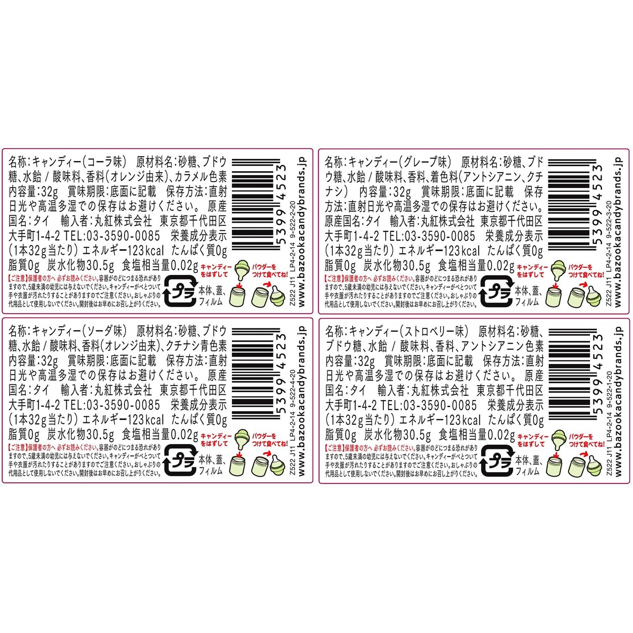 【コーラ】砂糖、ブドウ糖、水飴/酸味料、香料(オレンジ由来)、カラメル色素【グレープ】砂糖、ブドウ糖、水飴/酸味料、香料、着色料(アントシアニン、クチナシ)【ソーダ】砂糖、ブドウ糖、水飴/酸味料、香料(オレンジ由来)、クチナシ青色素【ストロベリー】砂糖、ブドウ糖、水飴/酸味料、香料、アントシアニン色素