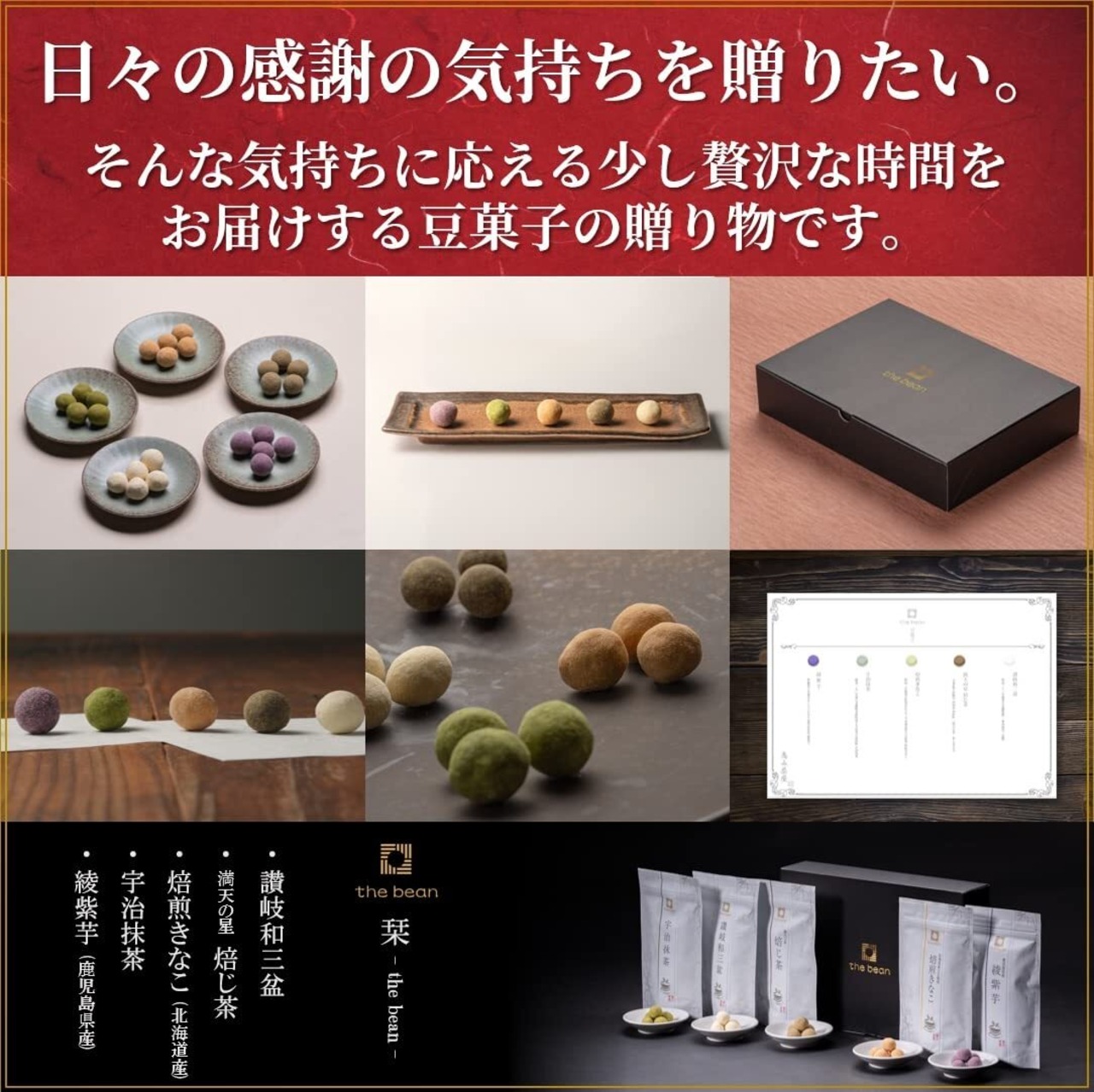 恵み茶屋 高級 豆菓子 ギフト -the_bean-(讃岐和三盆 焙じ茶 焙煎きなこ 宇治抹茶 綾紫芋 各40g 計200g) Premium Gift